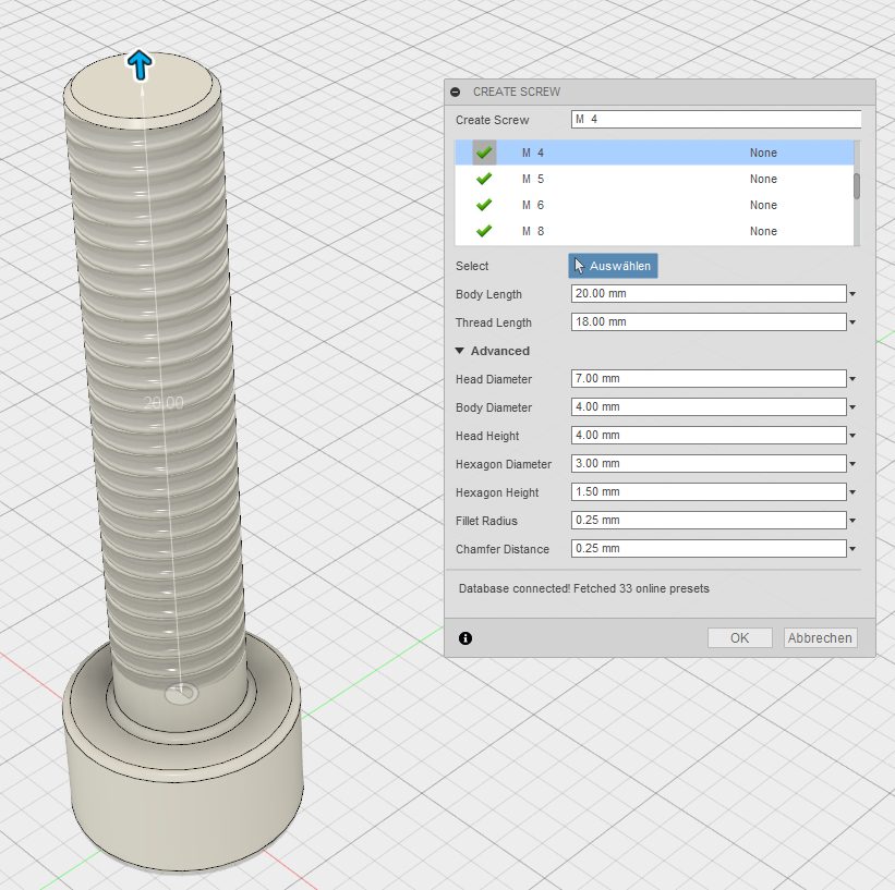 Bei der Freeversion vom 2024 Fusion360 weisen alle Tutorials zur Schrauben erstellung auf aktionen die kostenplfichtig sind, ohne die die Schraube kein Gewinde hat.