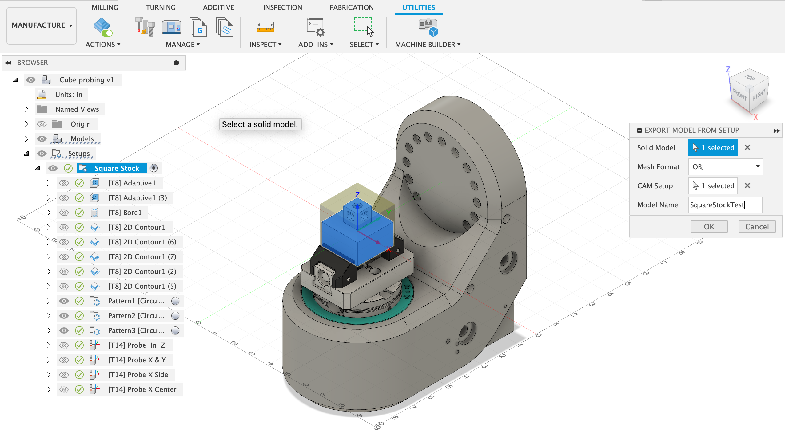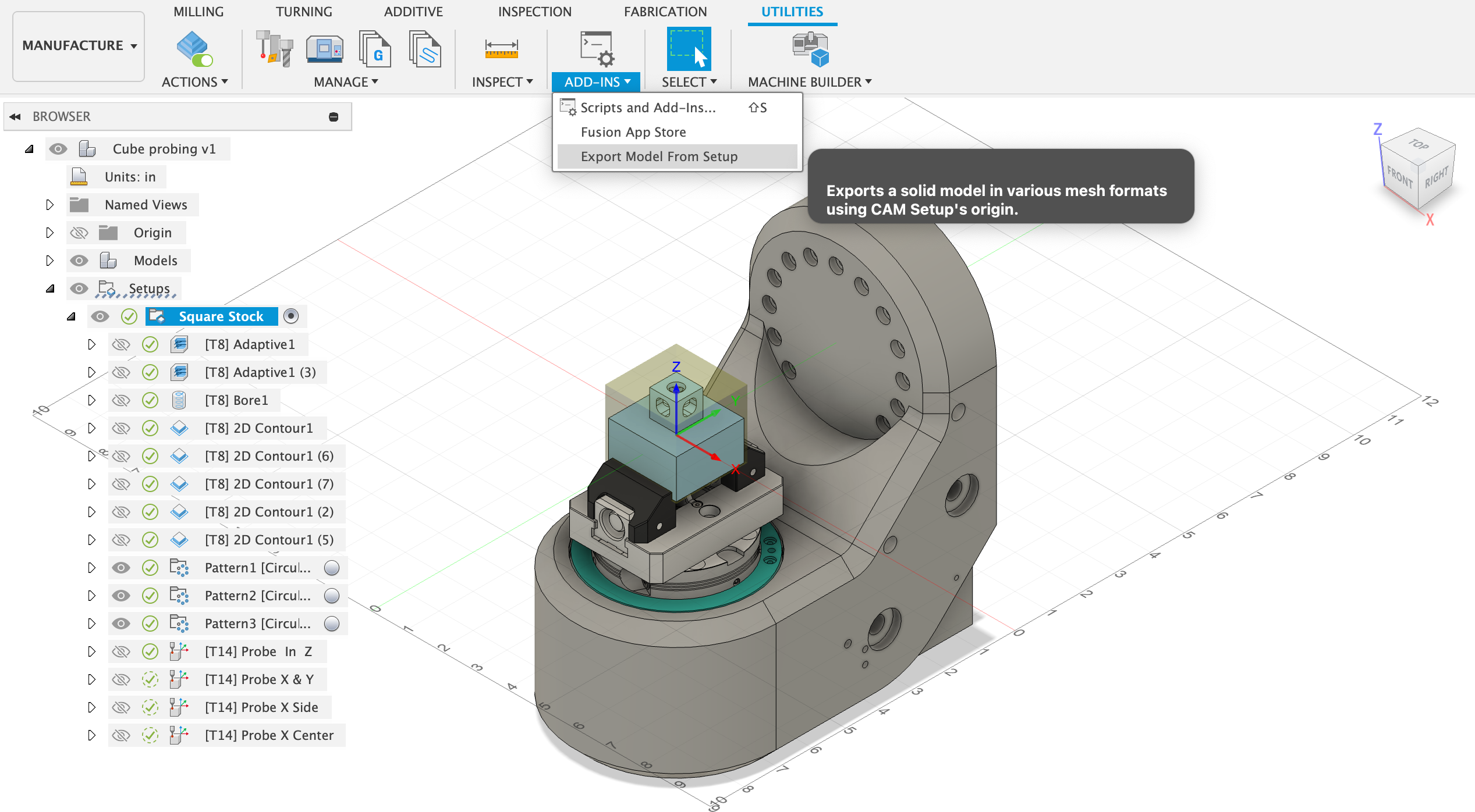 The simulator can display a mesh along with the path the tip of the tool takes while running your post-processed G code. However, the origin must be identical for the mesh and tool path to line up. Unfortunately, exporting a mesh from Autodesk® Fusion® uses the often arbitrary origin that is defined for your part, rather than the origin chosen in your CAM Setup that is used by your post-processed G code.