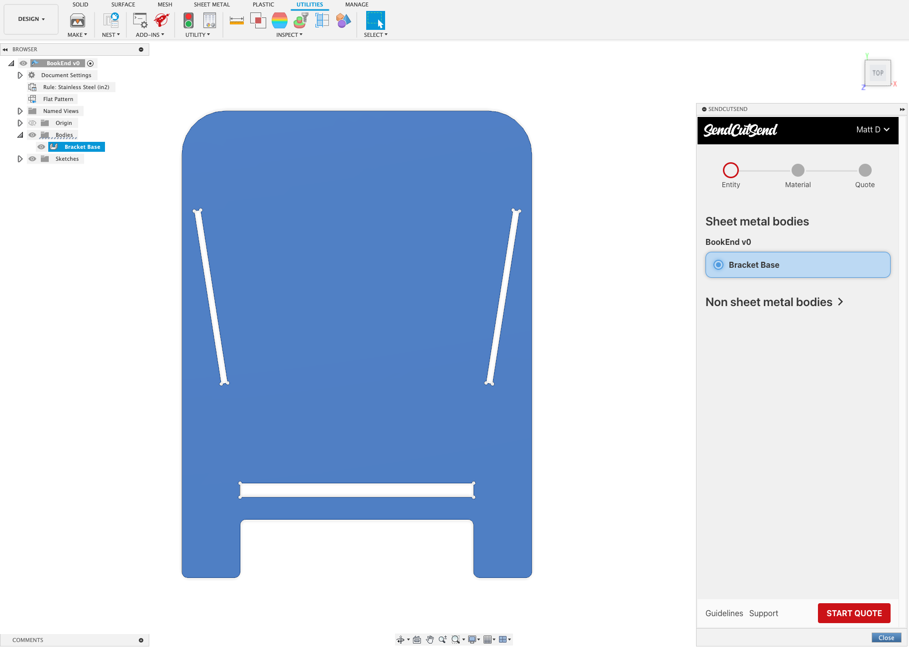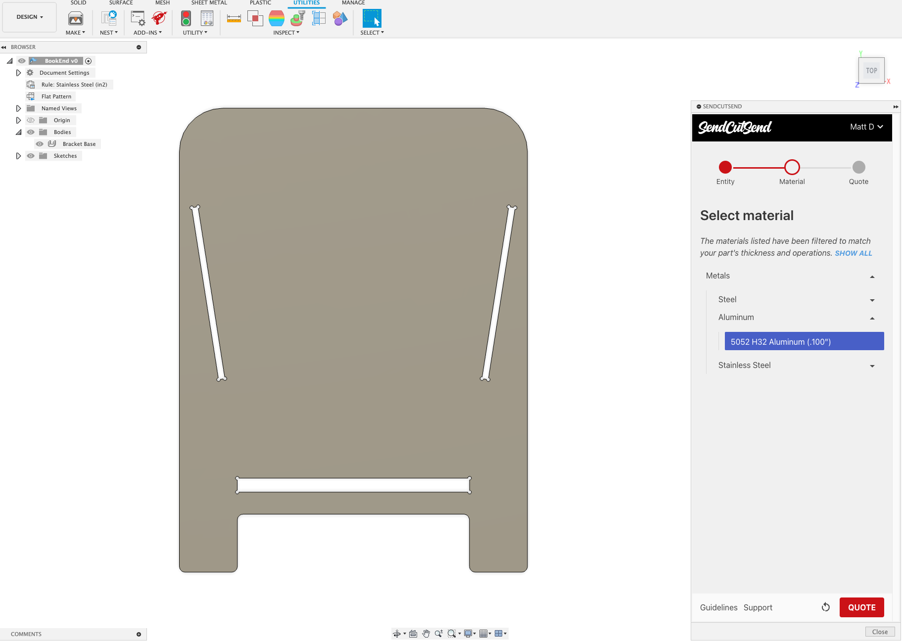 To use the SendCutSend Fusion plugin, simply create your parts as Sheet Metal Bodies. The plugin will automatically detect your thickness, bends and other part parameters. You can select the material you want to order, and your part will automatically be updated to your SendCutSend account.