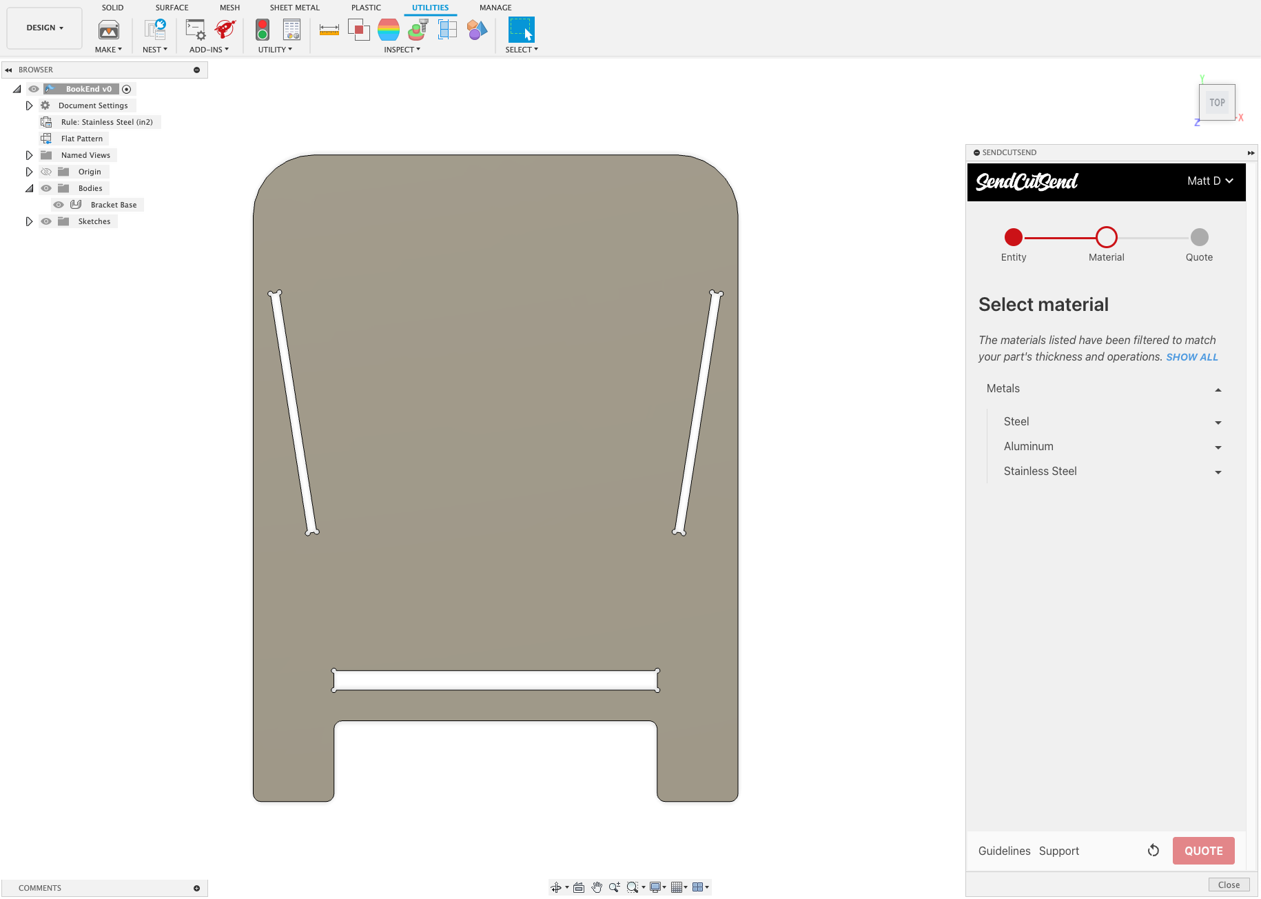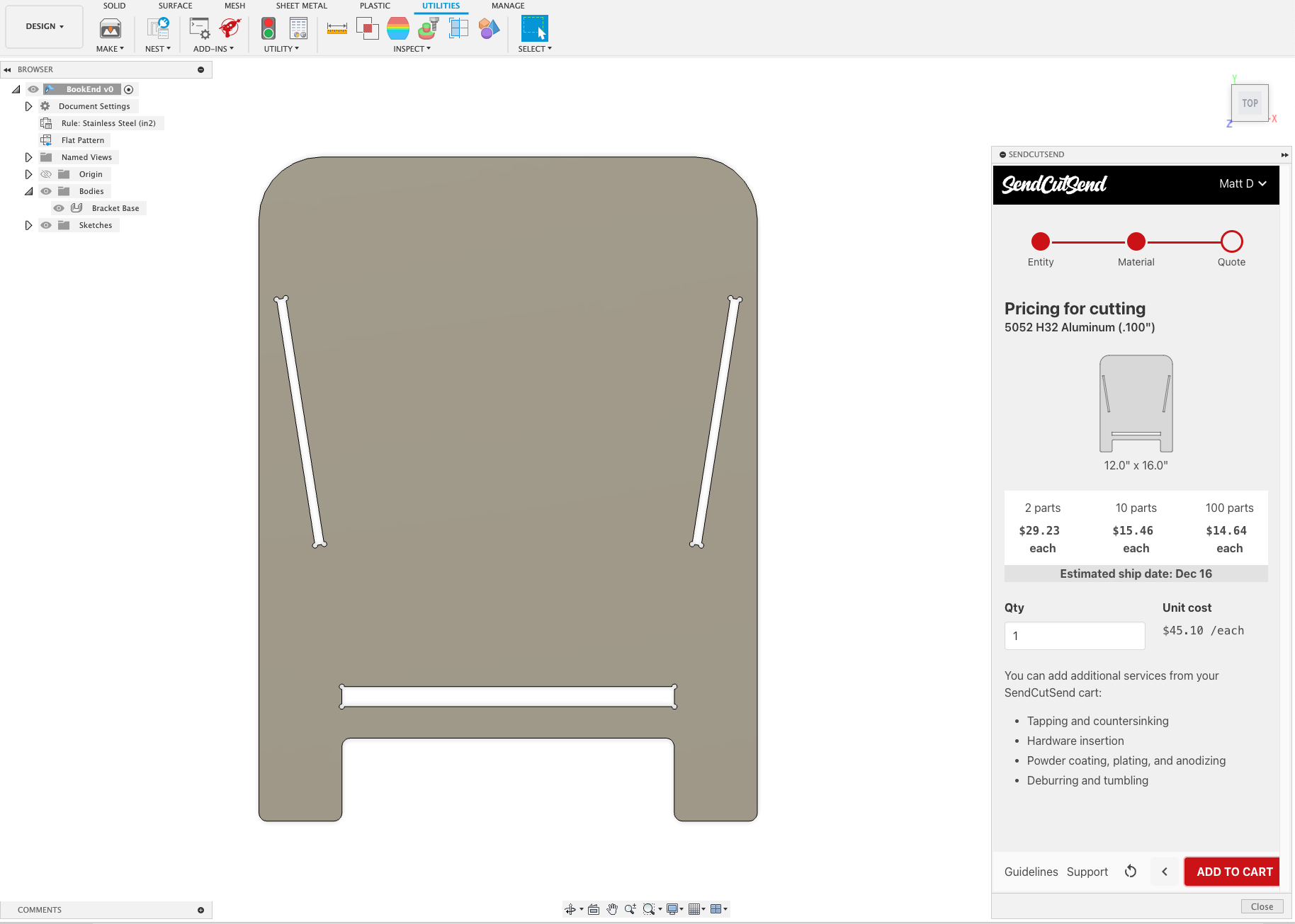 I particularly like the ability to compare prices by material and thickness so that I can design around cost constraints right from Fusion!