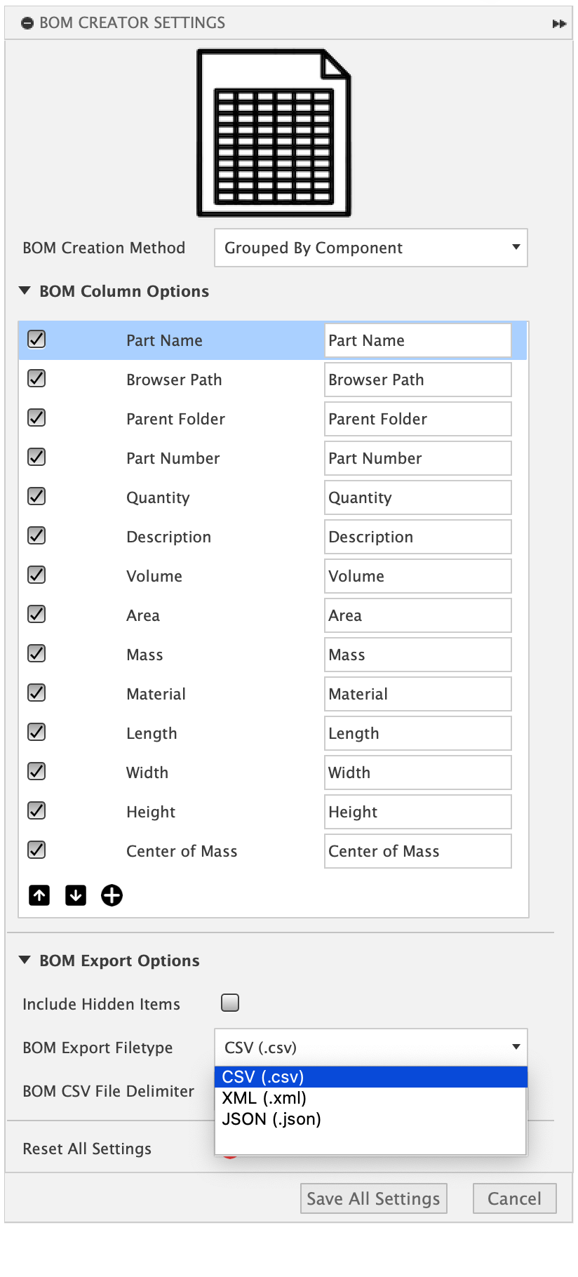 This add-in will enable you to export a Bill of Materials of a design as a CSV (.csv), XML (.xml) or JSON (.json) file in a very simple and efficient way.