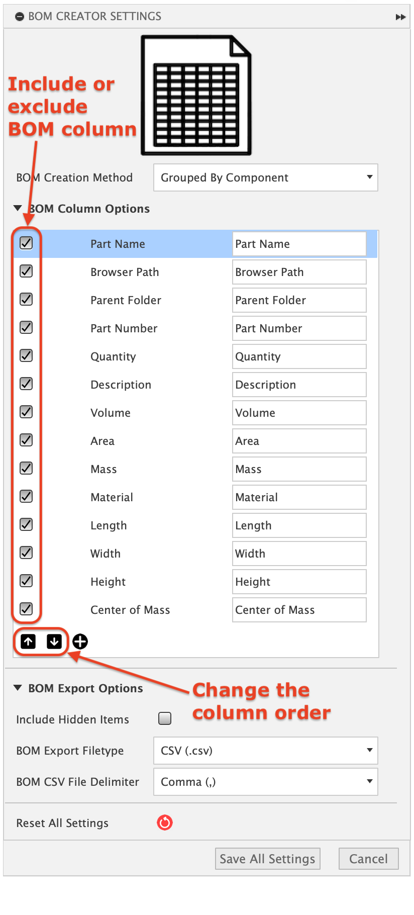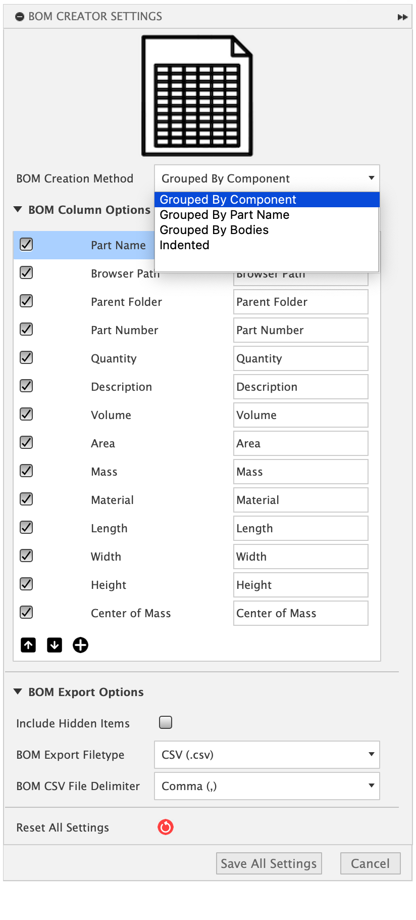 - Set the default BOM creation method (Grouped By Component, Grouped By Part Name, Grouped By Bodies or Indented)