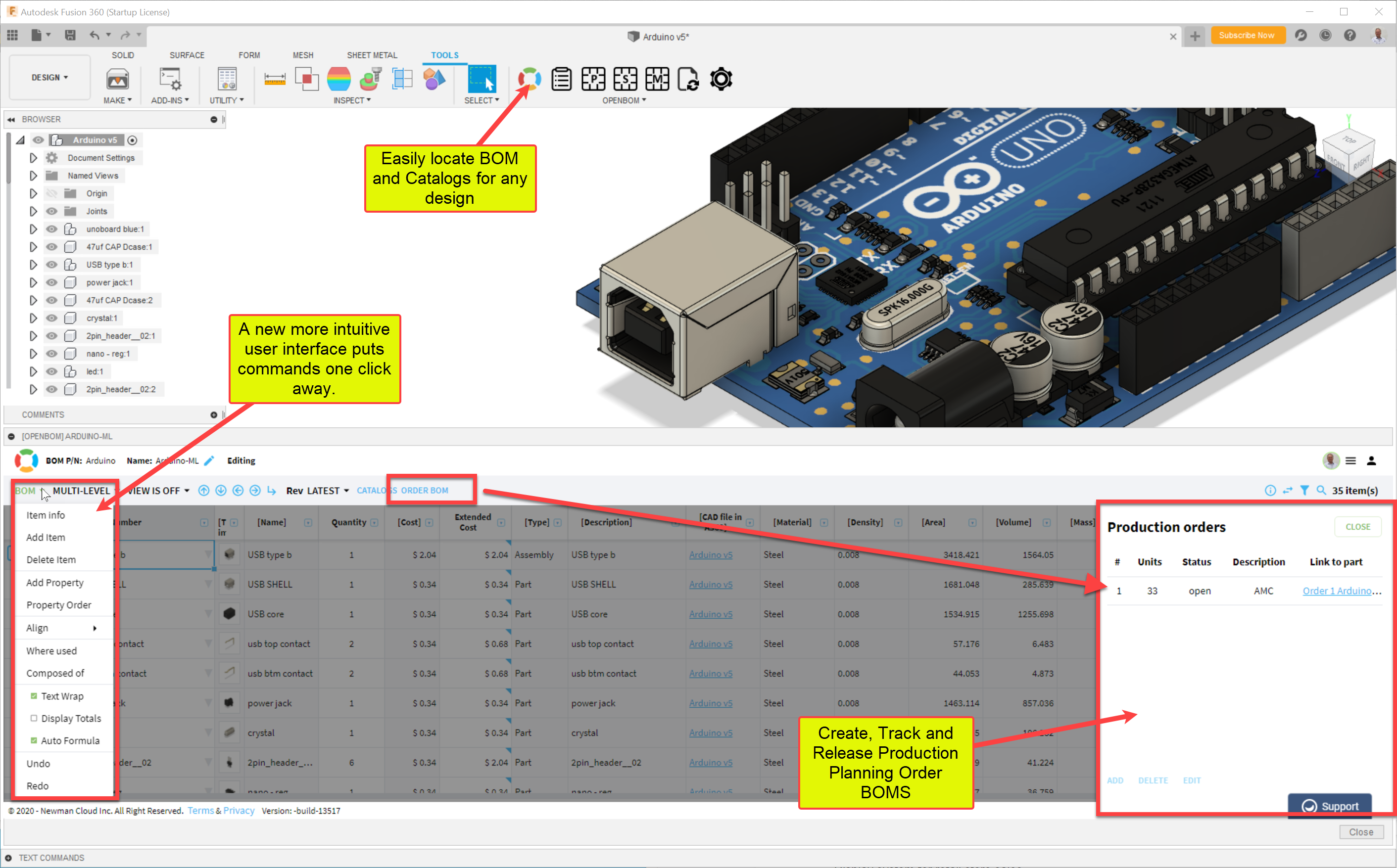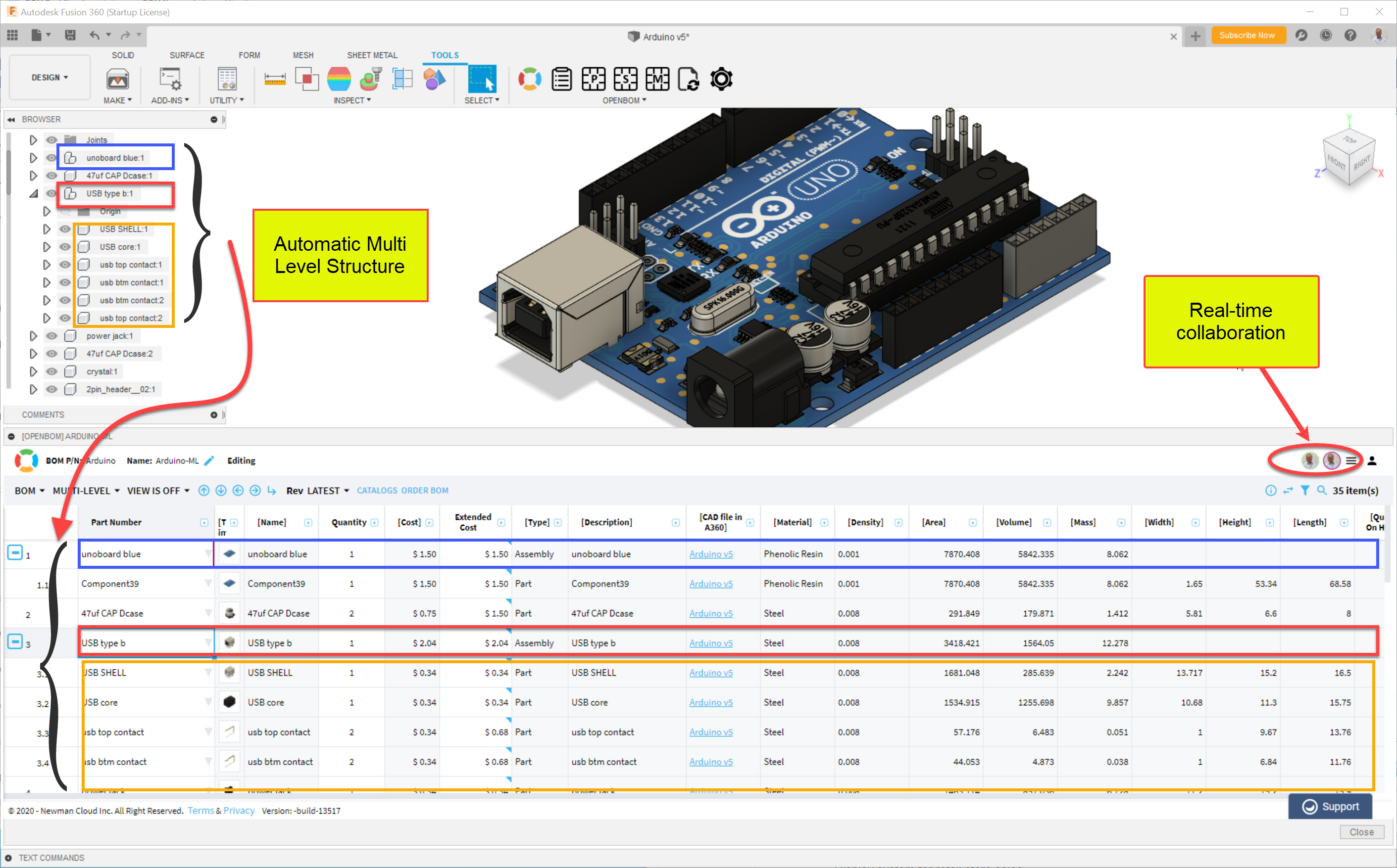 OpenBOM™ is an integrated Bill of Materials, Production Planning and Inventory management system for engineering teams, manufacturing companies, and supply chain enabling users to collaborate in real-time across global networks of engineers, contractors, and suppliers. Use the OpenBOM for Autodesk® Fusion® to create BOMs directly from within Fusion 360 and save them to OpenBOM.