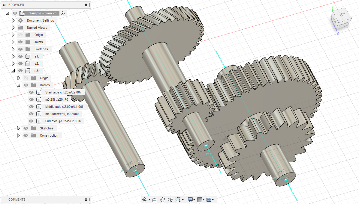 The plugin creates gear trains for various sets of parameters. It lets you create single gears, pairs of gears, adapters (single-stage reductions) or trains assembled of many stages. Each gear can be dimensioned in millimeters or inches independently. Units of axles can be changed too. You can set ordinary parameters like module, pressure or helix angle or apply modifications by profile shifting, tip reliefs (addendum), backlashes, tapering or chamfers. Profile shift factors can be also calculated automatically in case of manually set center distance (by X-Y shift). Parameters and descriptions of functions are available in Guide.pdf. Information about invoices is available in the Consulting Services section (please click More to expand the section).