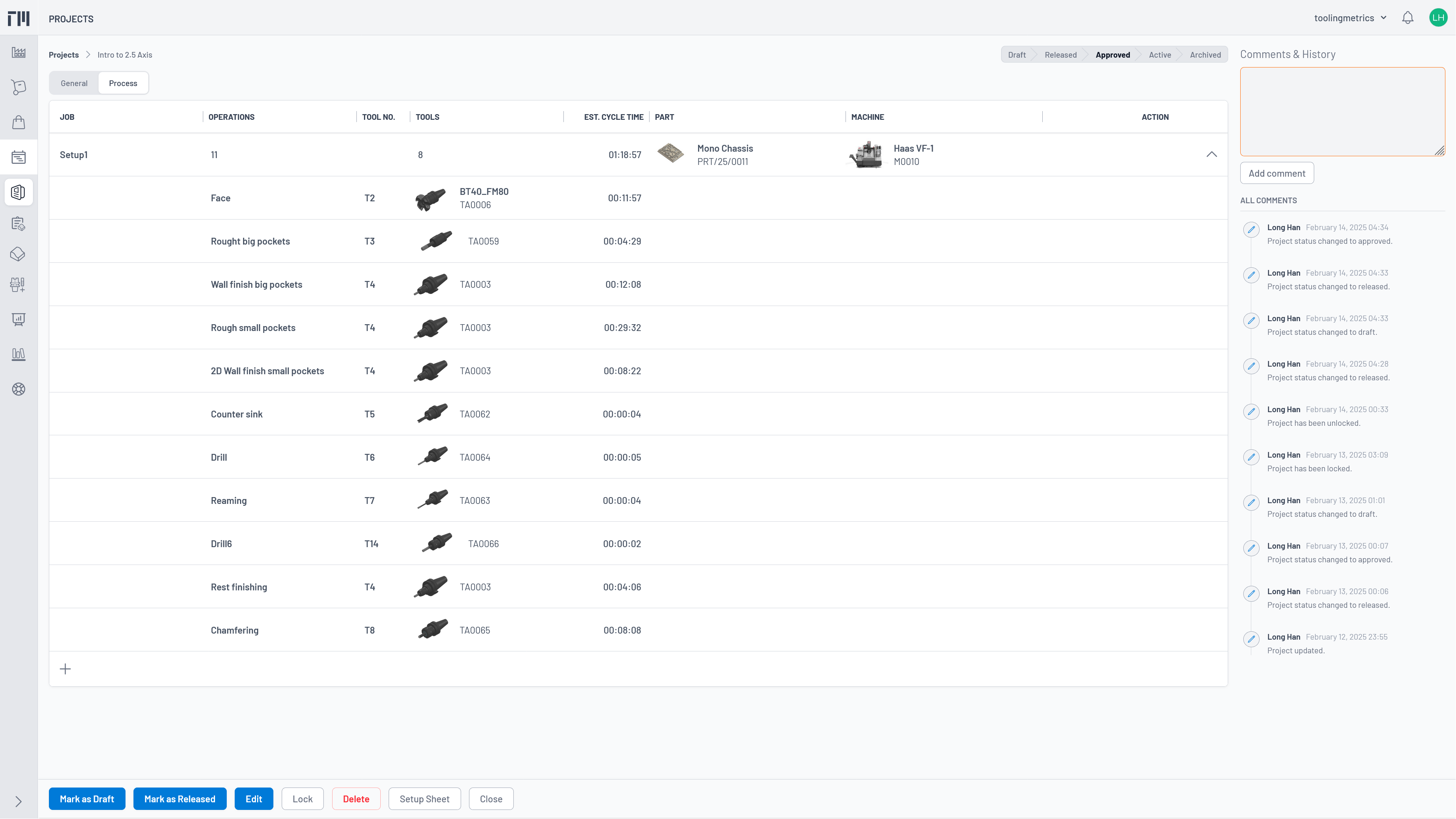 - Approve the project when it ready to send to your machinists, operators in the shop floor. When you do that, all items uses in the tools list will automatic check to created new one if needed.