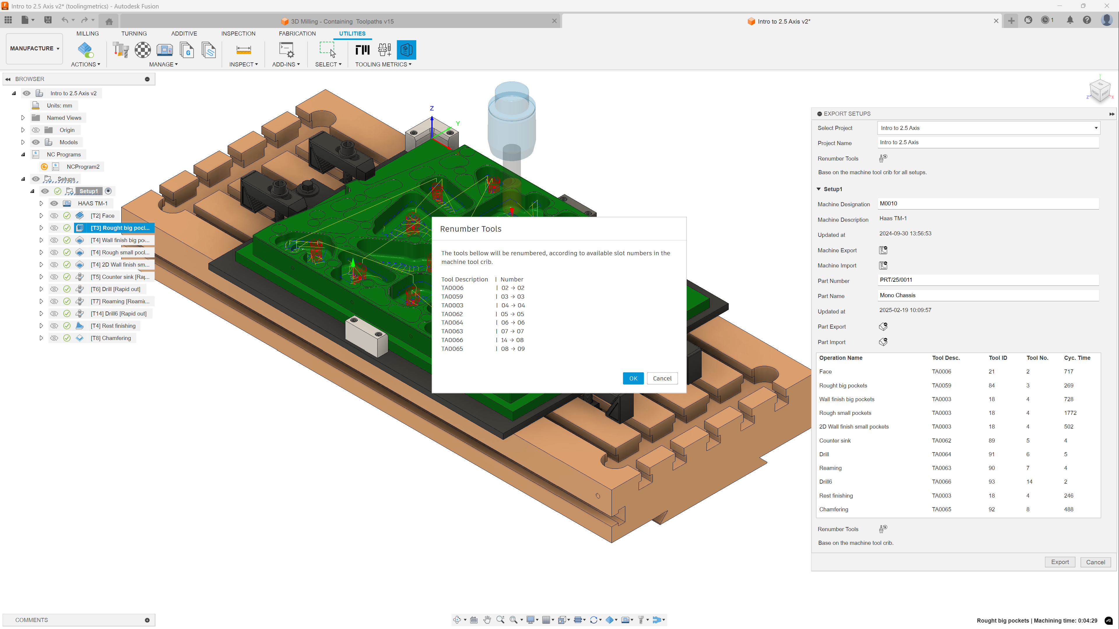 - Renumber Tools: Renumber the Tools in each setup or all setups in CAM documents (when all setups using the same machine) base on the Tool is available on the machine Tool Cribs. This let you know the available tools can be use, without need to commissioning a new one. And using that tool slot number in your CAM programs, minimize the tool changes when setup for a job.