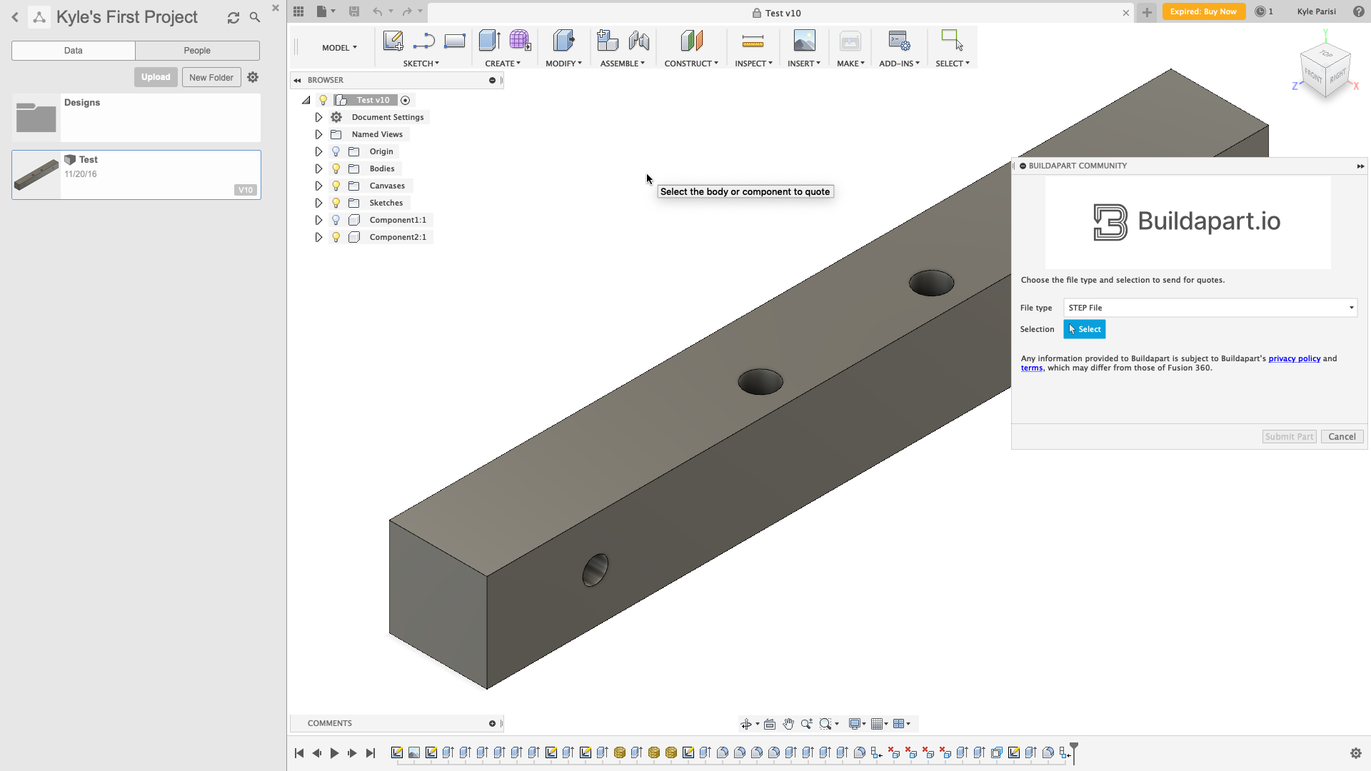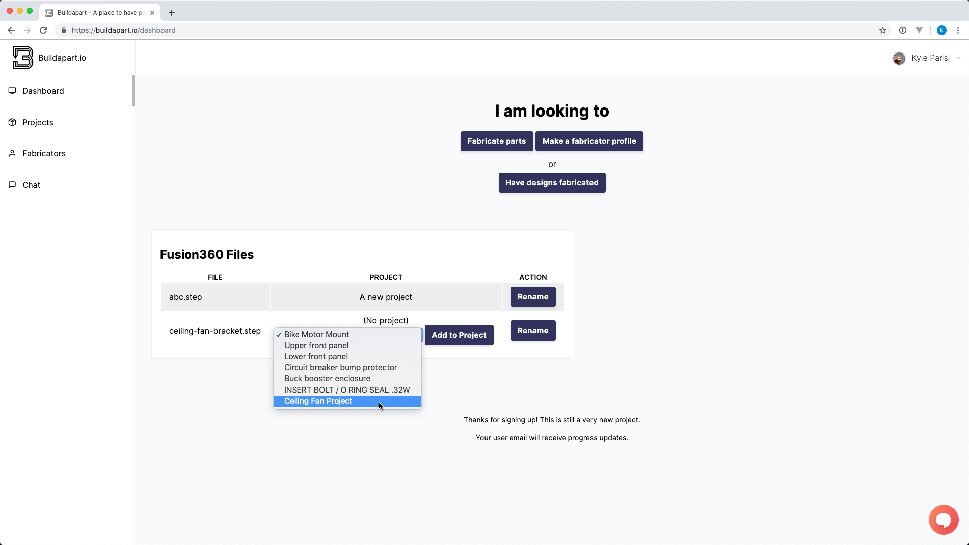 Use Buildapart to have your parts made. Select a part from your design to be uploaded to buildapart.io. After it is uploaded you'll have the option to create a project describing the quantity, materials, and tools. After your project is made, Buildapart will review the submission and approve it for the fabricator community to then review the project. Members will reach out to you to have the part made. Submit your parts today, to have them made!