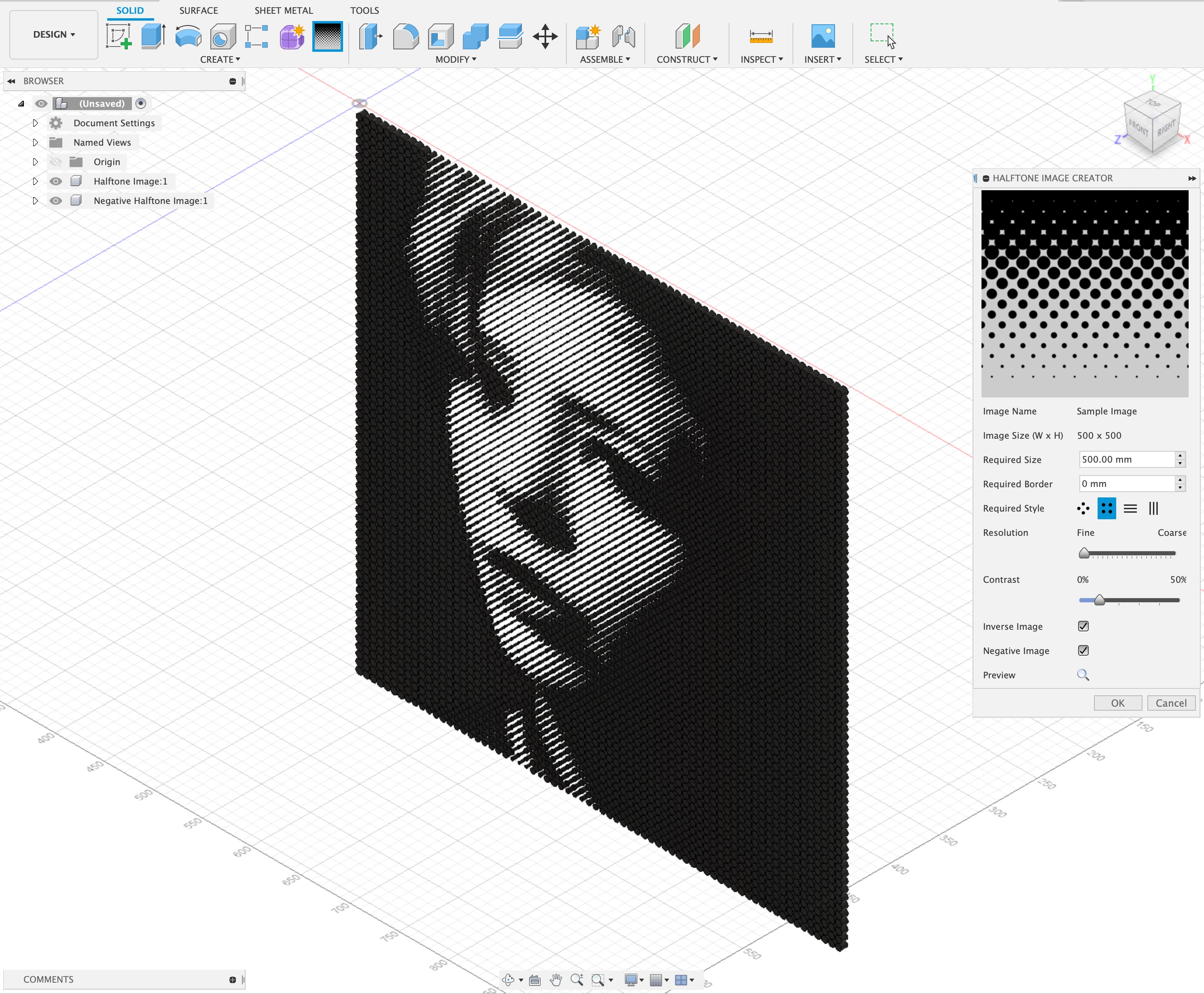 The halftone image is generated from a user-specified image file. The halftone image result can be adjusted in size, can include a border and be created using different pattern styles. Other options include resolution adjustment, image inverse and an image negative to create a 3D printer friendly result.