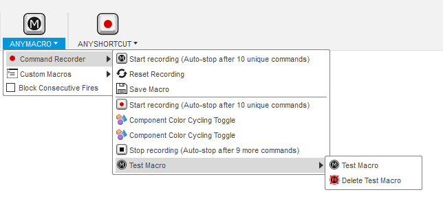 AnyMacro is an add-in for Autodesk® Fusion 360™ for chaining multiple commands in a row to form a Macro. Macros are created from a set of commands which run while the add-in is recording. The macro, when finished, will fire each of the recorded commands consecutively. Additionally, the macros created can be mapped to keyboard shortcuts for ease of access.
