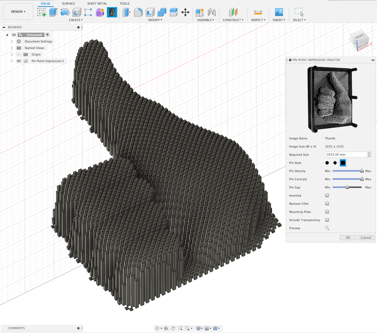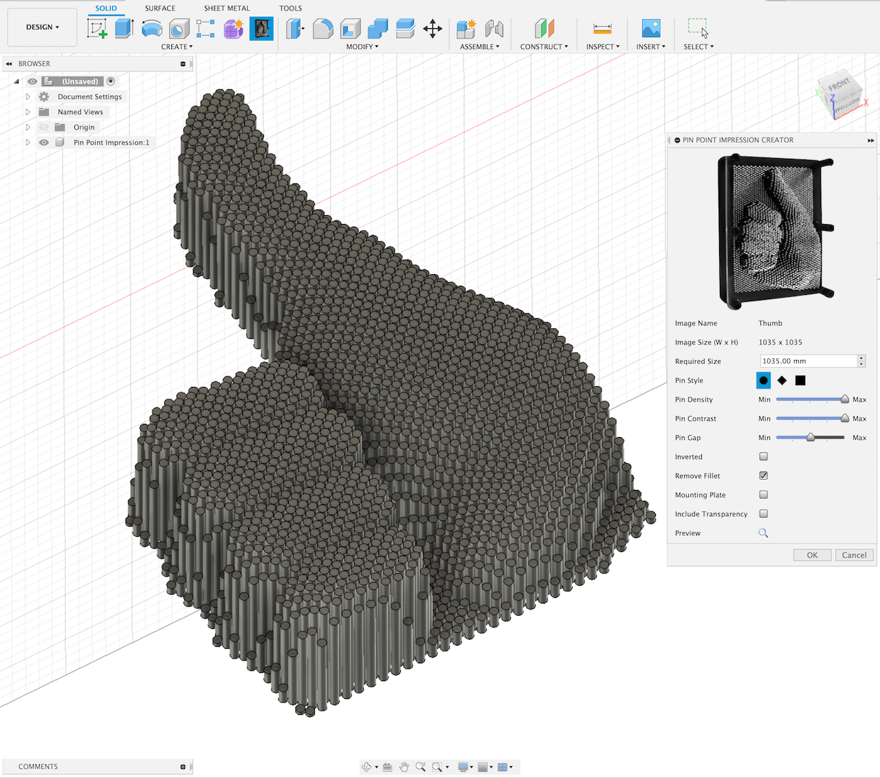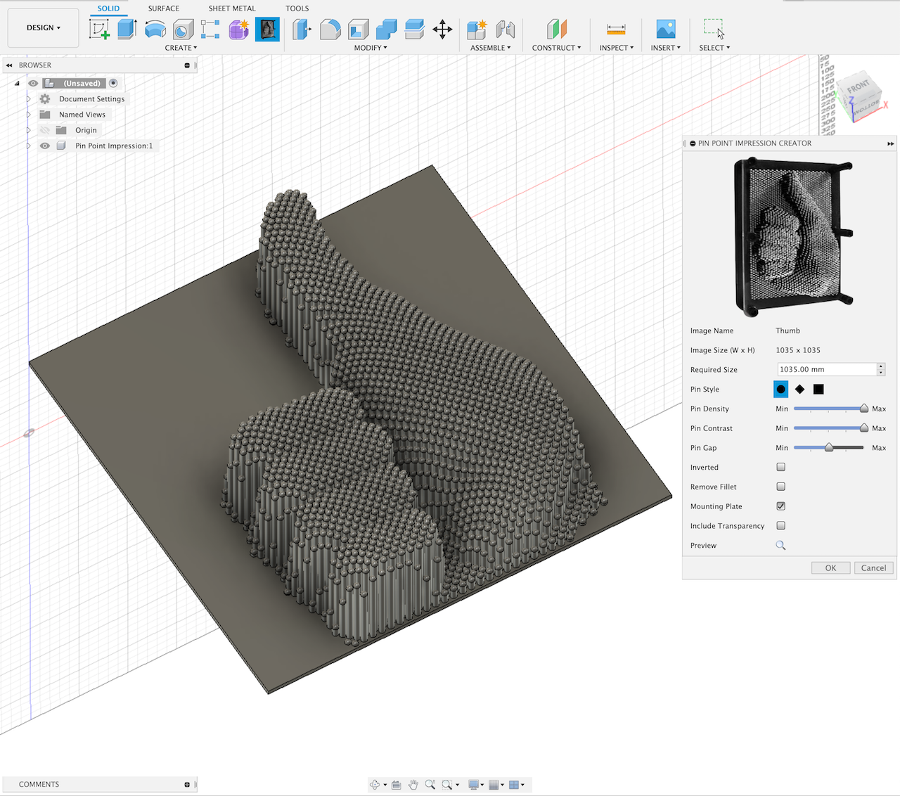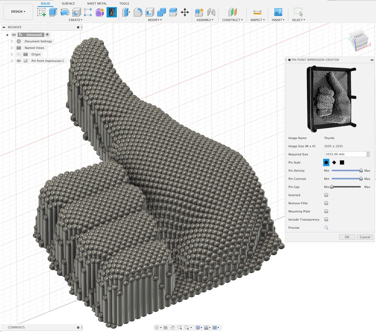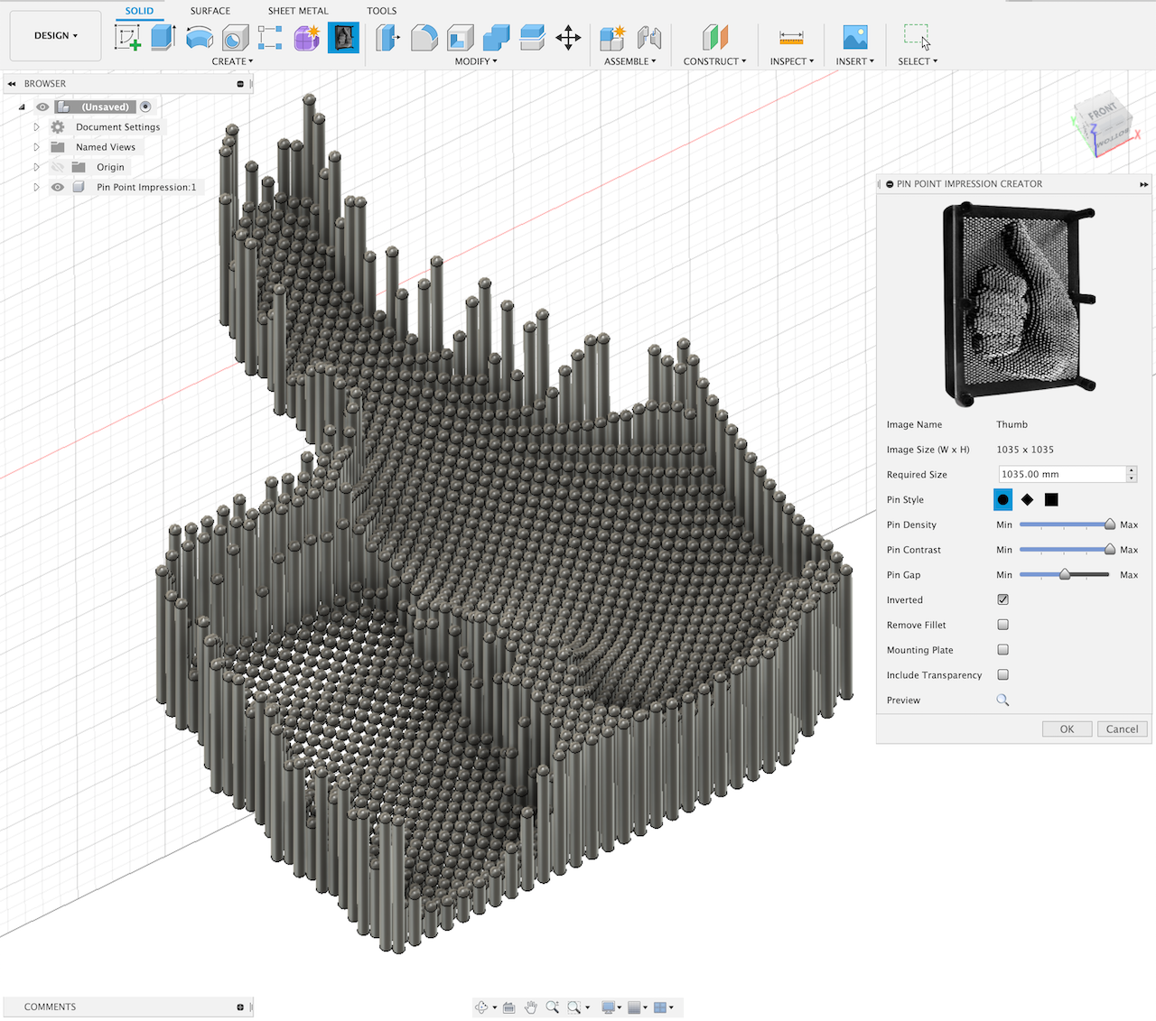 The pin point impression is generated from a user-specified image file. The pin point impression result can be adjusted in size and be created using different styles. Other options include pin density, pin contrast, pin gap, inverted image, flat pin ends, a mounting plate for 3D printing and an option to include the image transparency in the result.