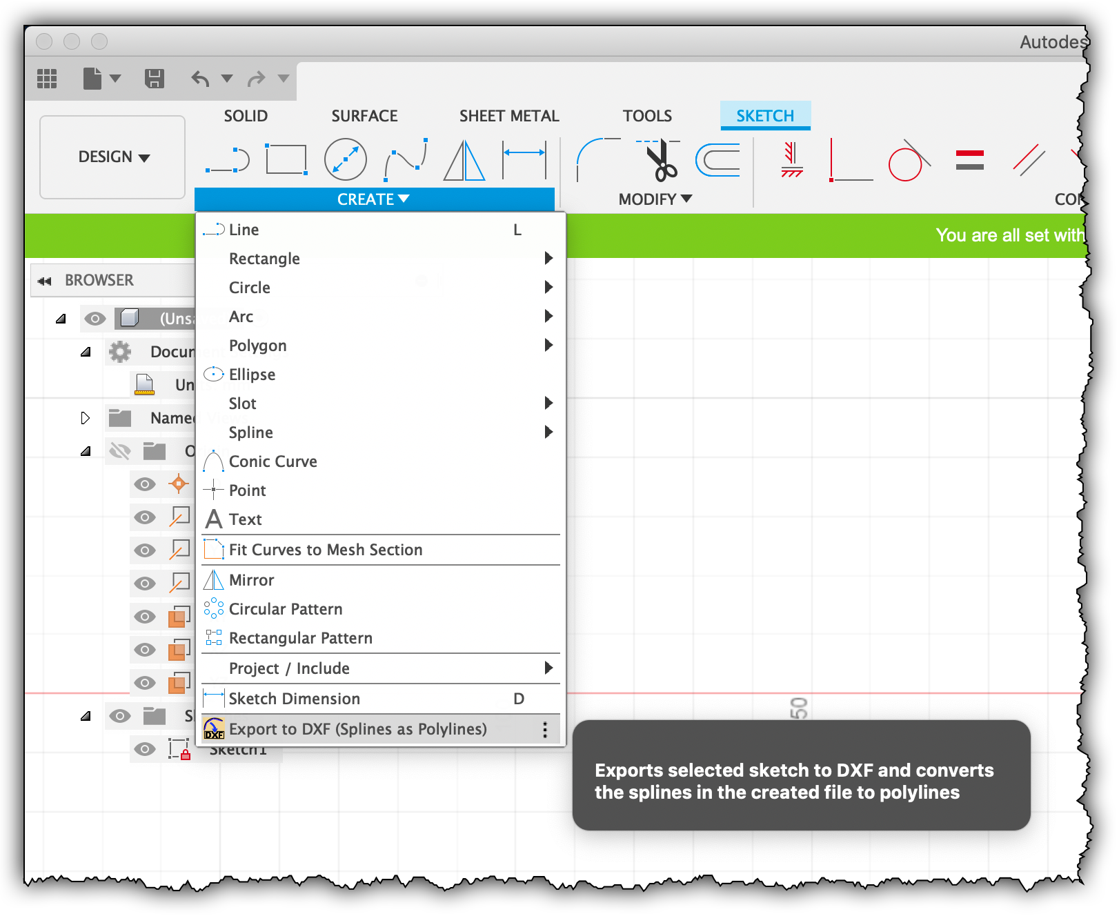 Autodesk® Fusion 360™ add-in lets the user export the selected sketch to a DXF file in which the splines have been converted to polylines.
