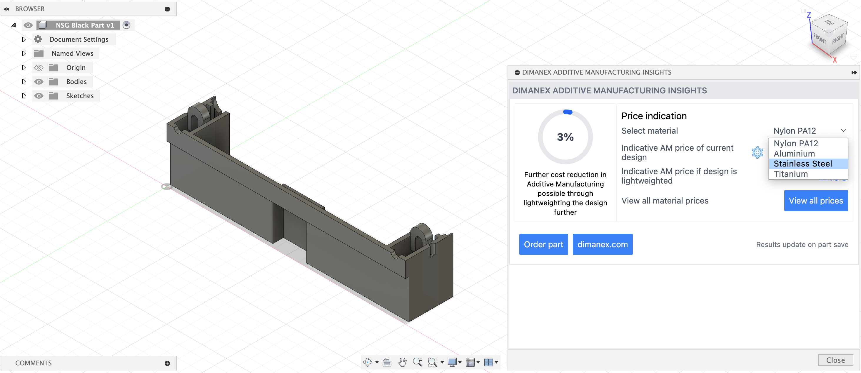 - Material & Cost reduction potential – immediate view on how much material and cost can be saved by redesigning a part with AM as manufacturing technology
