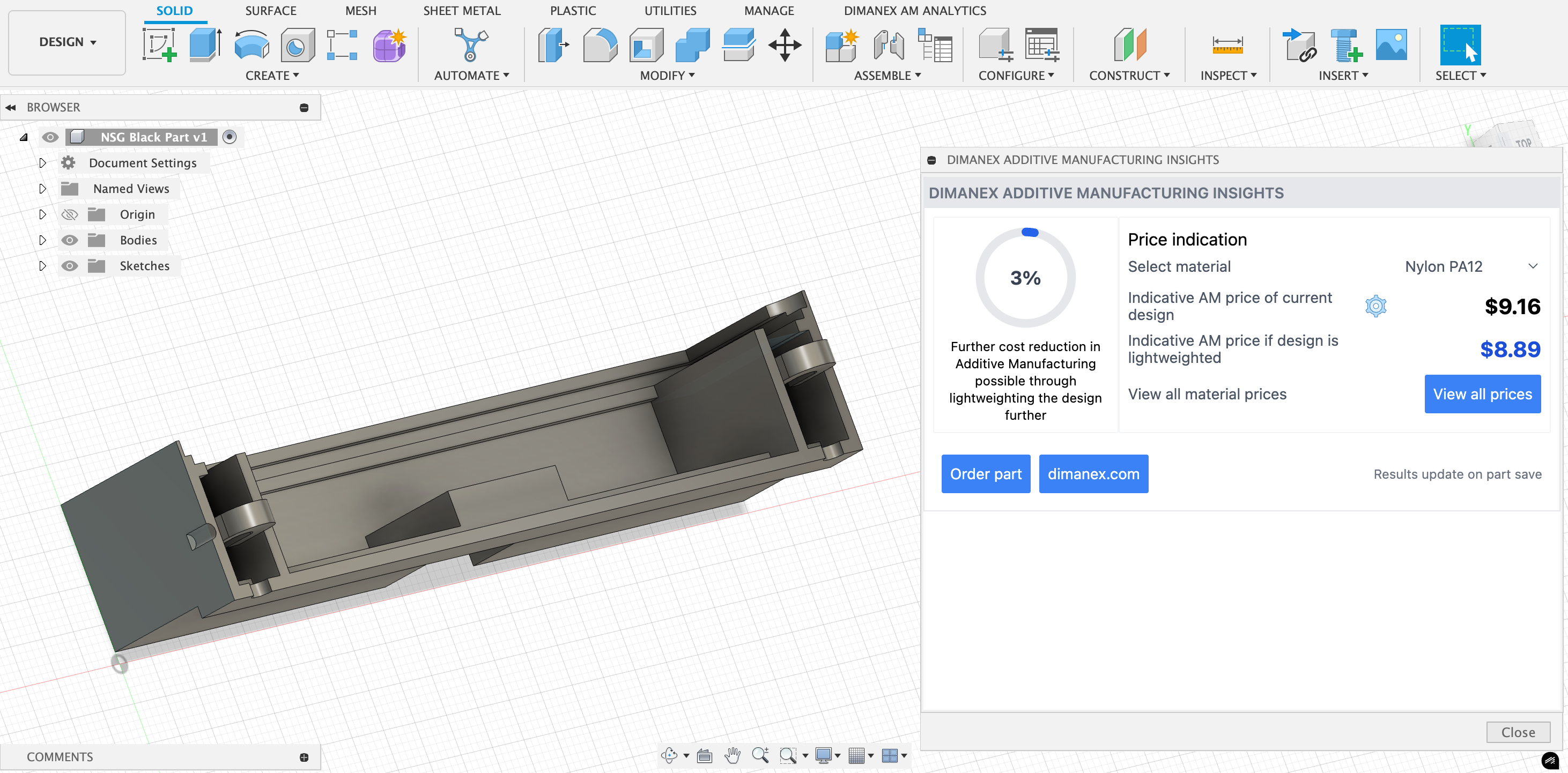 - Cost savings – Save production costs on having parts 3D printed that have been identified for redesign in additive manufacturing and that have been redesigned in Fusion. Order only the amount of parts needed, rather than high Minimum Order Quantities, to save supply chain costs like; stock keeping cost, capital cost, transport cost, scrapping cost and more.
