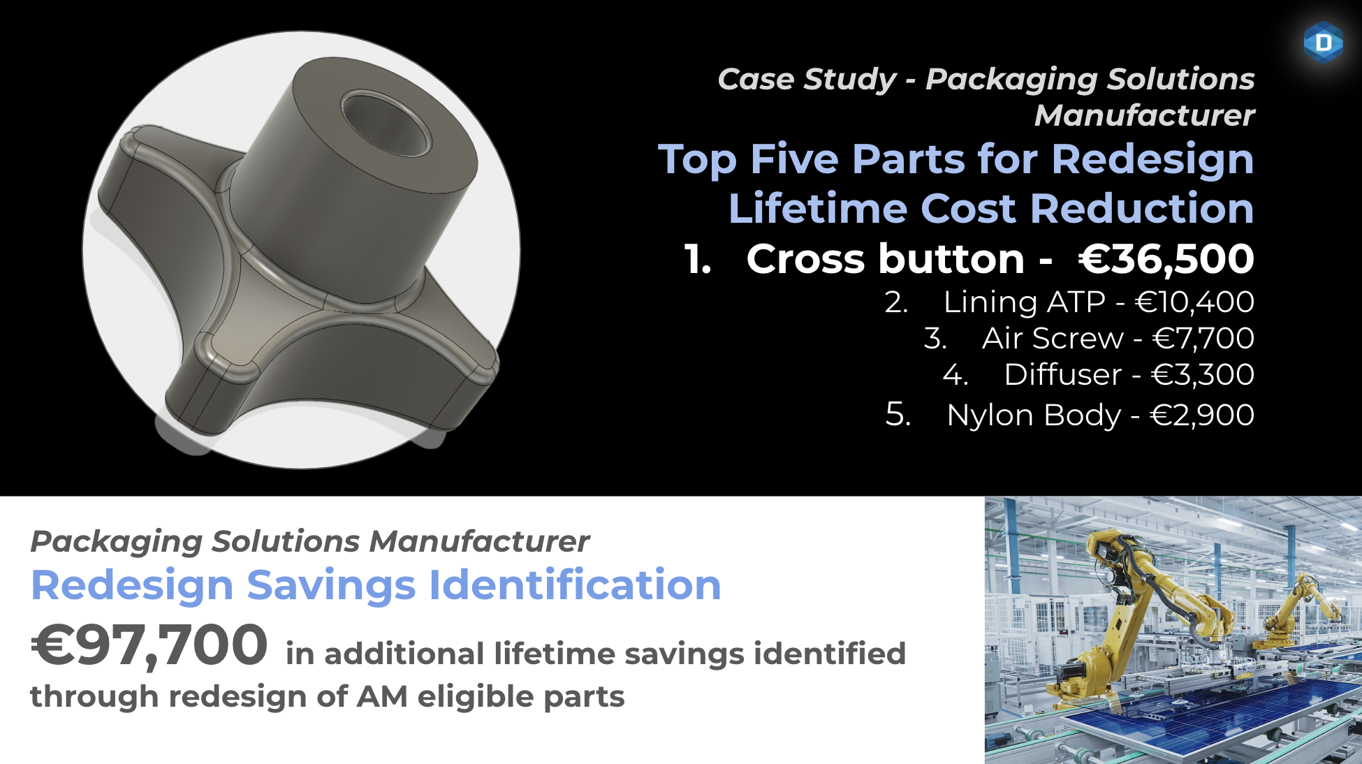 Very useful insights into design, savings and printing potential of Additive Manufacturing application.