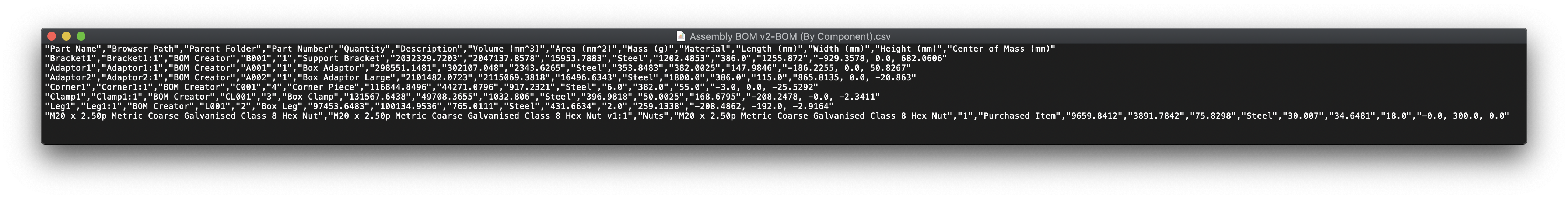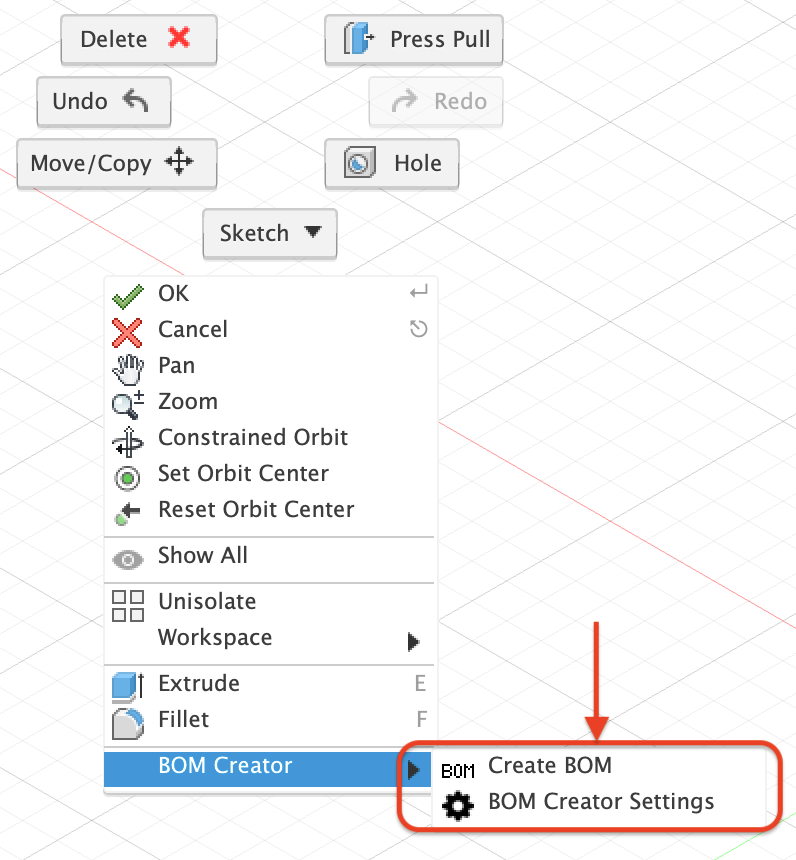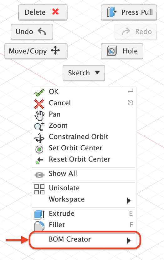 The Bill of Materials is generated from the components within a design. You can quickly export the bill of materials using the right-click context menu that will save a CSV file to a user-specified location.