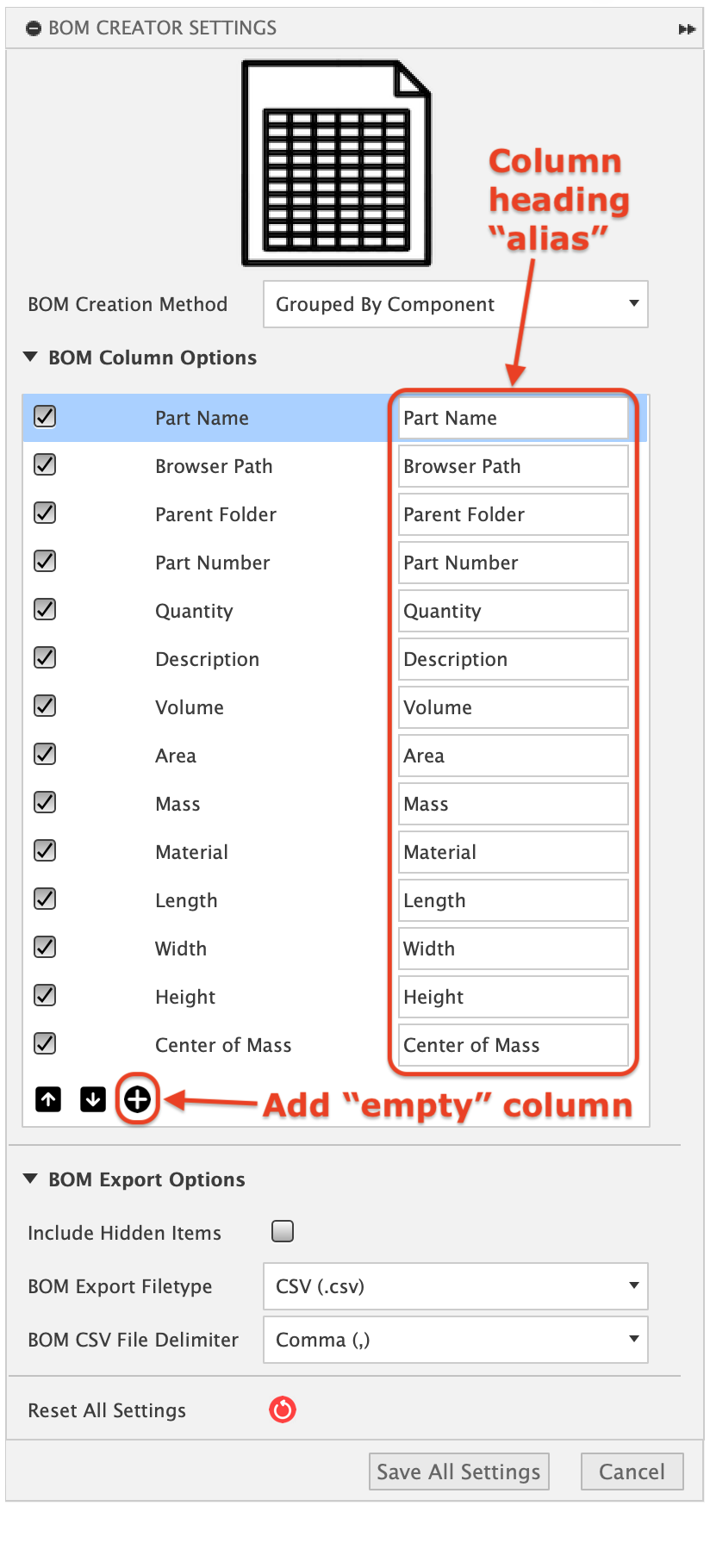 - Change the BOM column heading using an “alias”.