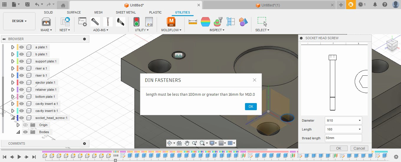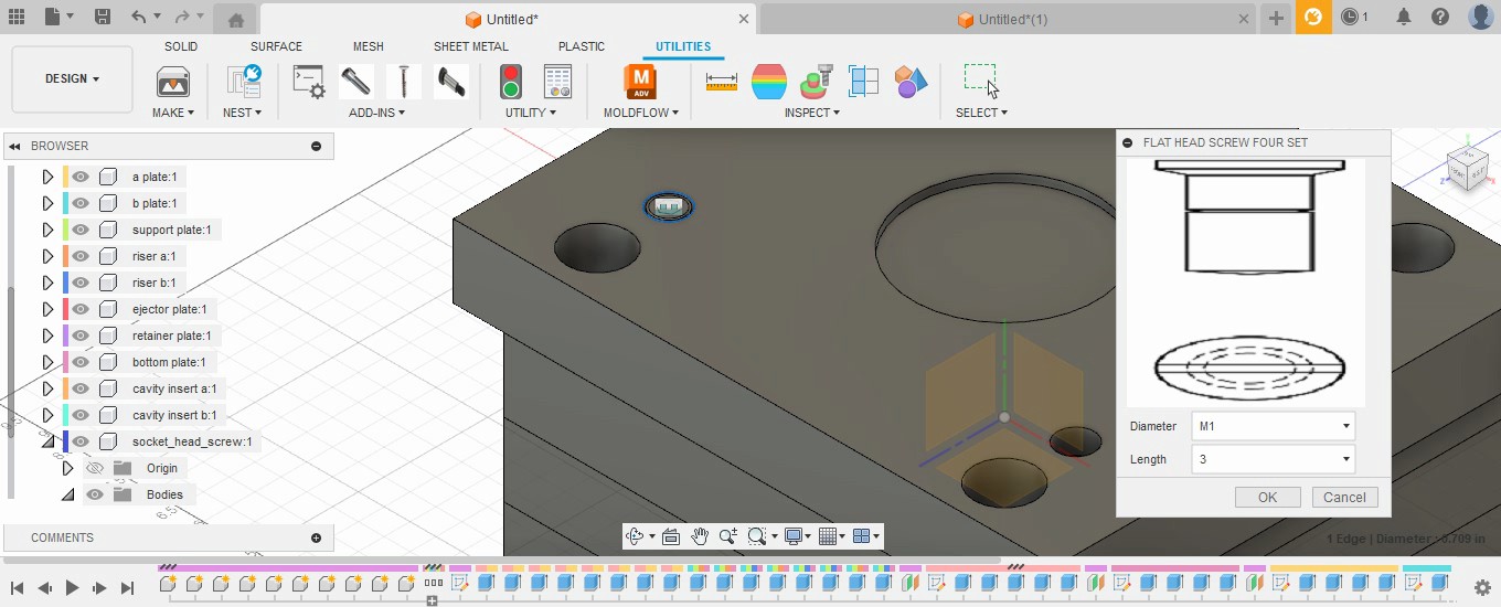 Introducing FastenerCraft Suite for Mold Design in Autodesk® Fusion® the comprehensive solution designed to elevate your mold design workflow. Tailored exclusively for mold designers, this suite offers the effortless creation of socket heads, flat heads, and shoulder socket head screws. All the screws are designed concerning DIN standard dimensions, the user only needs two selections and one input for the screws to be created.