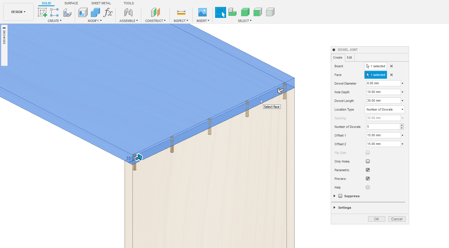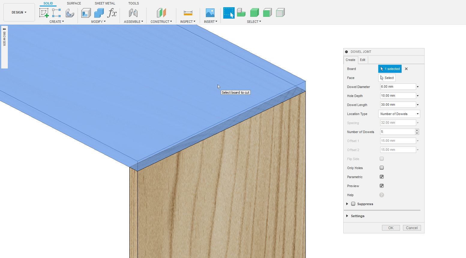 Dowel Joint add-in creates a dowel joint between two boards. This add-in allows you to specify the dimensions and location of the joint. It is particularly useful in woodworking.