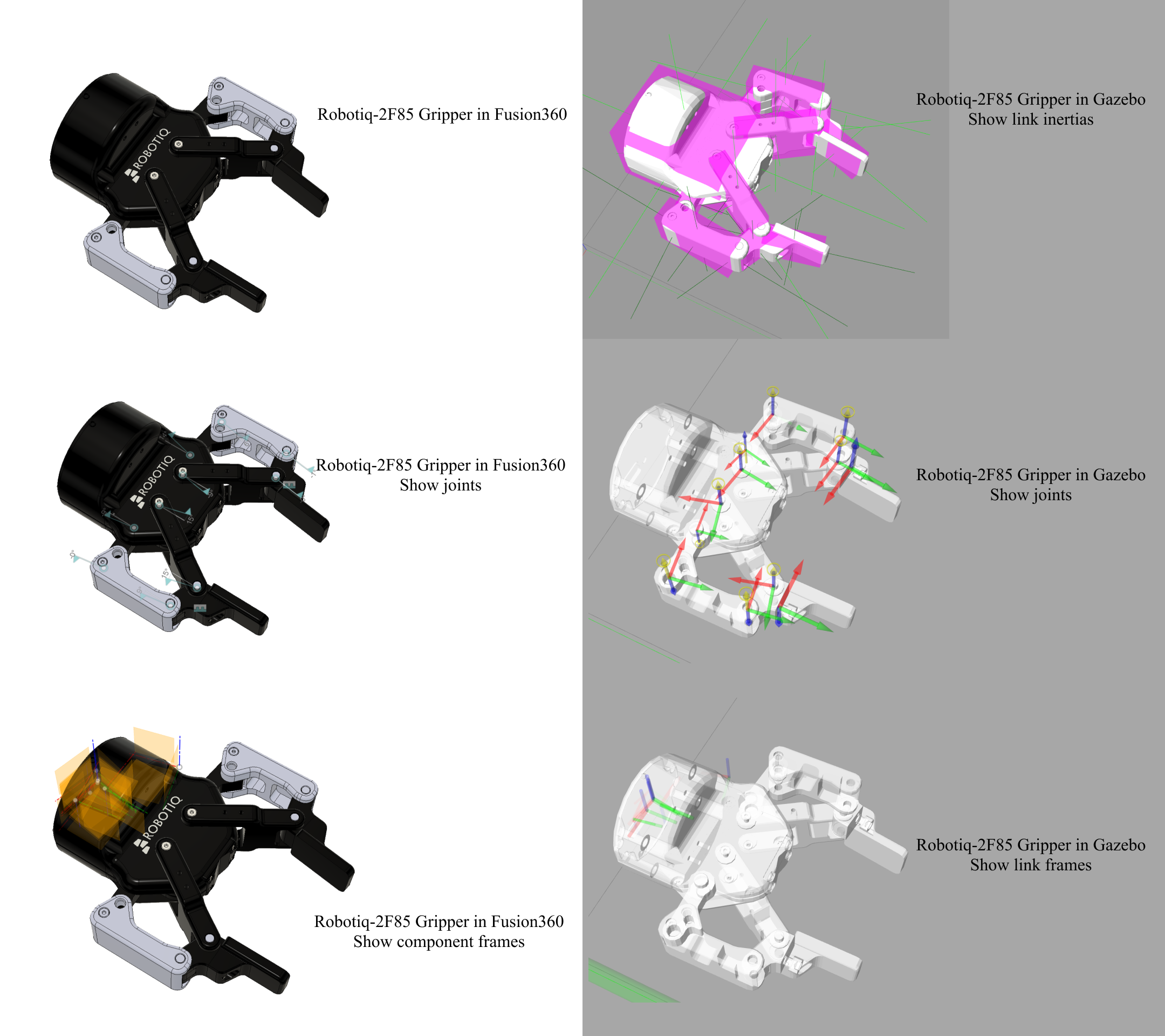 Currently, this Add-In supports exporting URDF, SDFormat, and MJCF. URDF (Unified Robotics Description Format) is the most widely used robot description format but has several limitations and lacks of updates. SDFormat (Simulation Description Format) has more features than URDF, such as supporting a closed loop chain mechanism. Other robot description formats might be supported in the future.