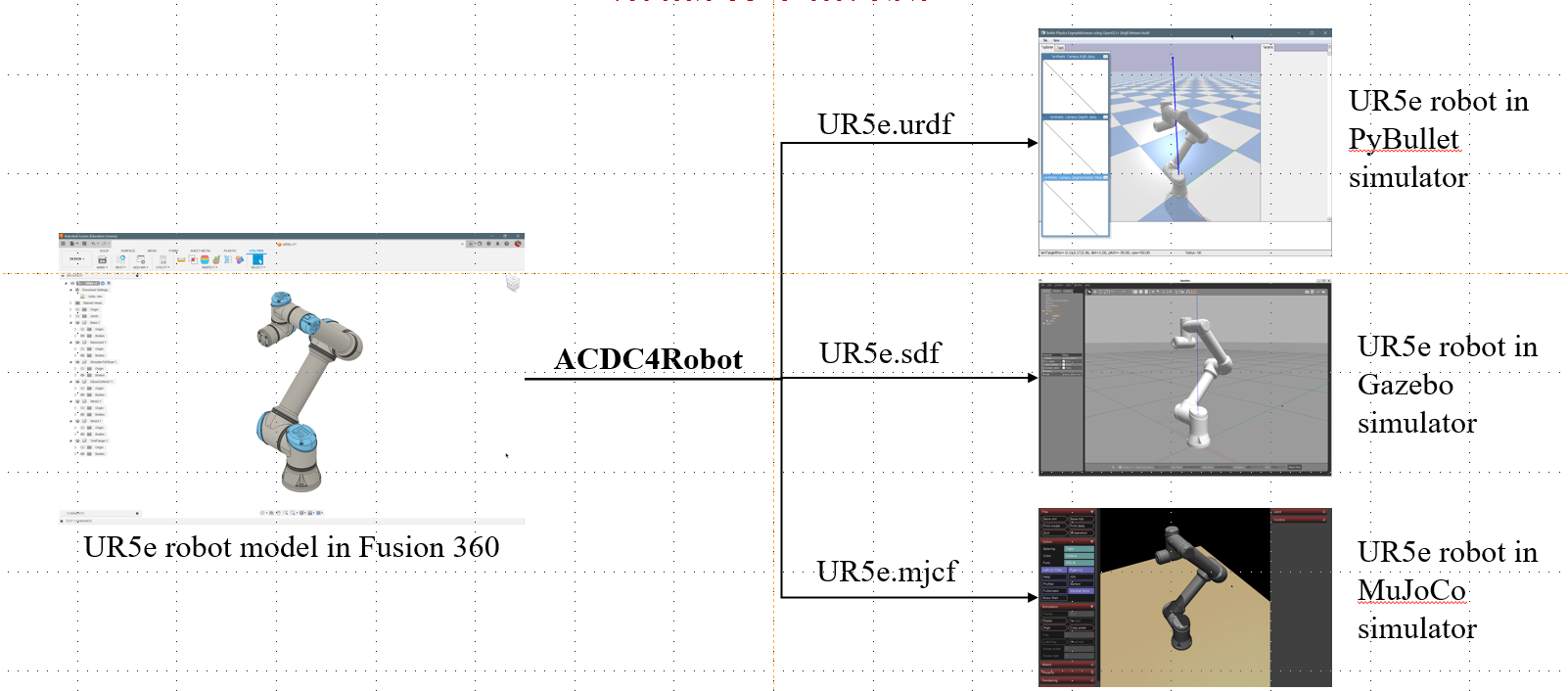 ACDC4Robot is an open-sourced add-in for Autodesk® Fusion® for exporting robot models into URDF, SDFormat, and MJCF. This add-in aims to accelerate the process from robot design to robot simulation.