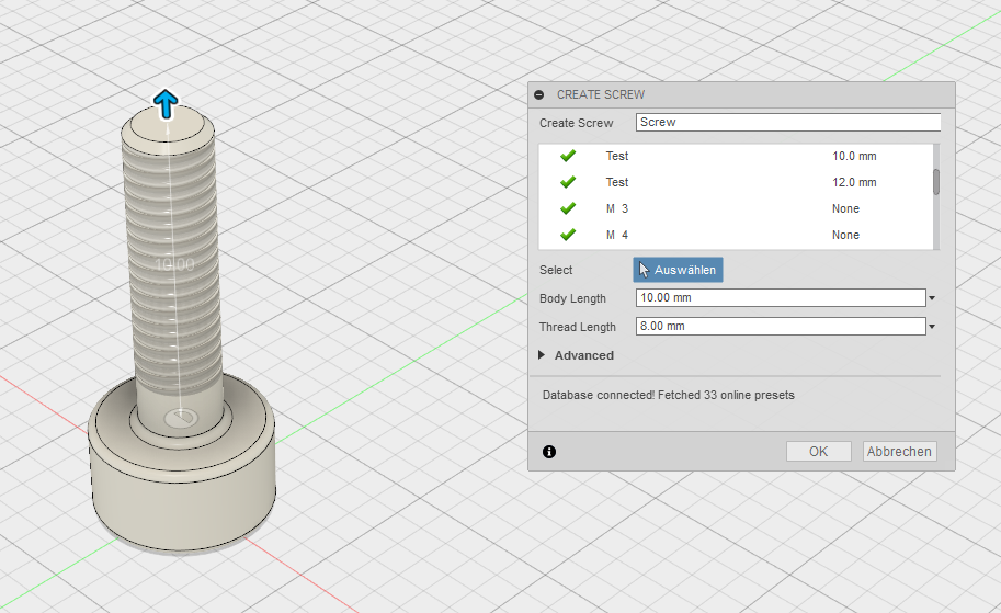 Bei der Freeversion vom 2024 Fusion360 weisen alle Tutorials zur Schrauben erstellung auf aktionen die kostenplfichtig sind, ohne die die Schraube kein Gewinde hat.