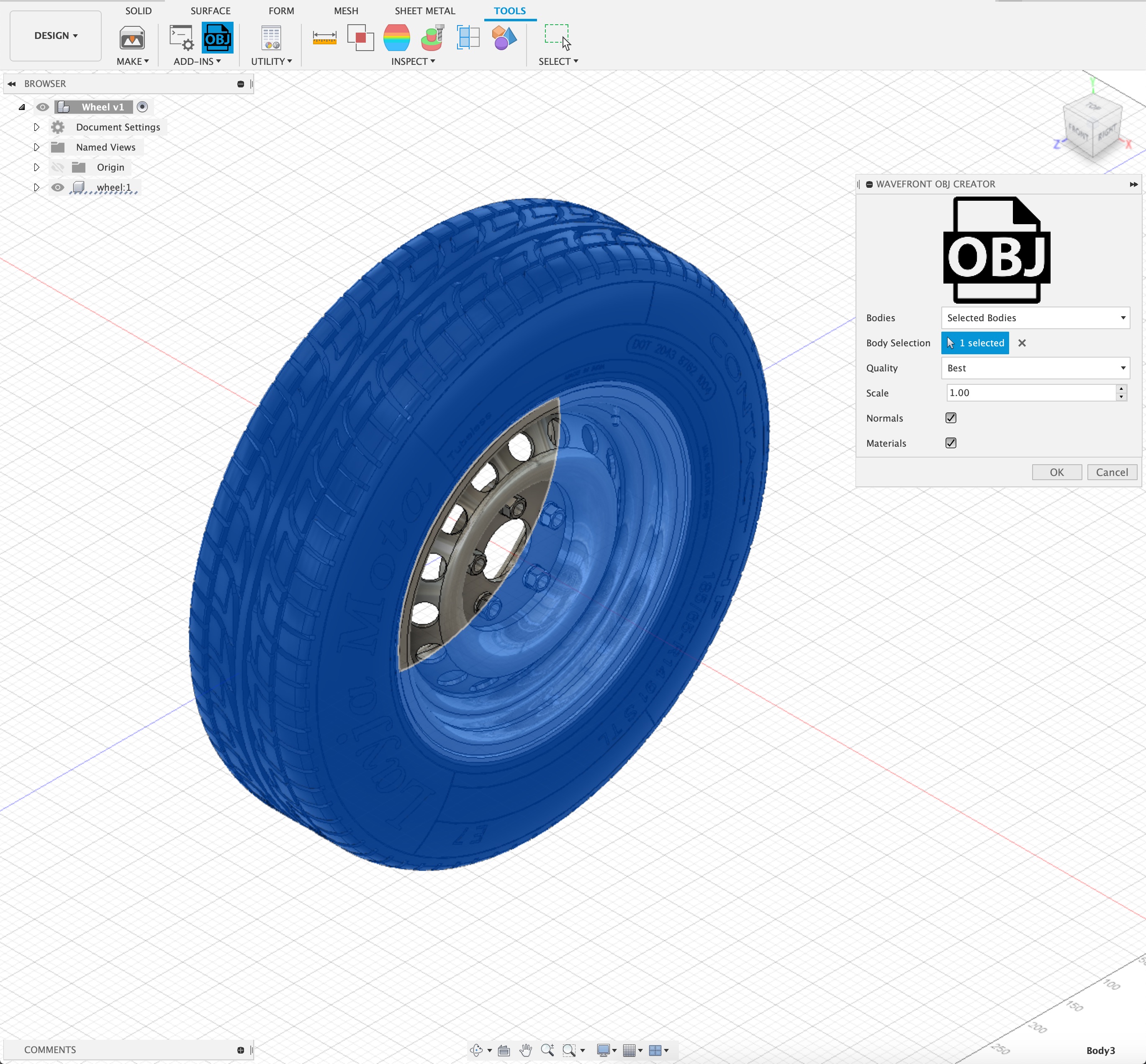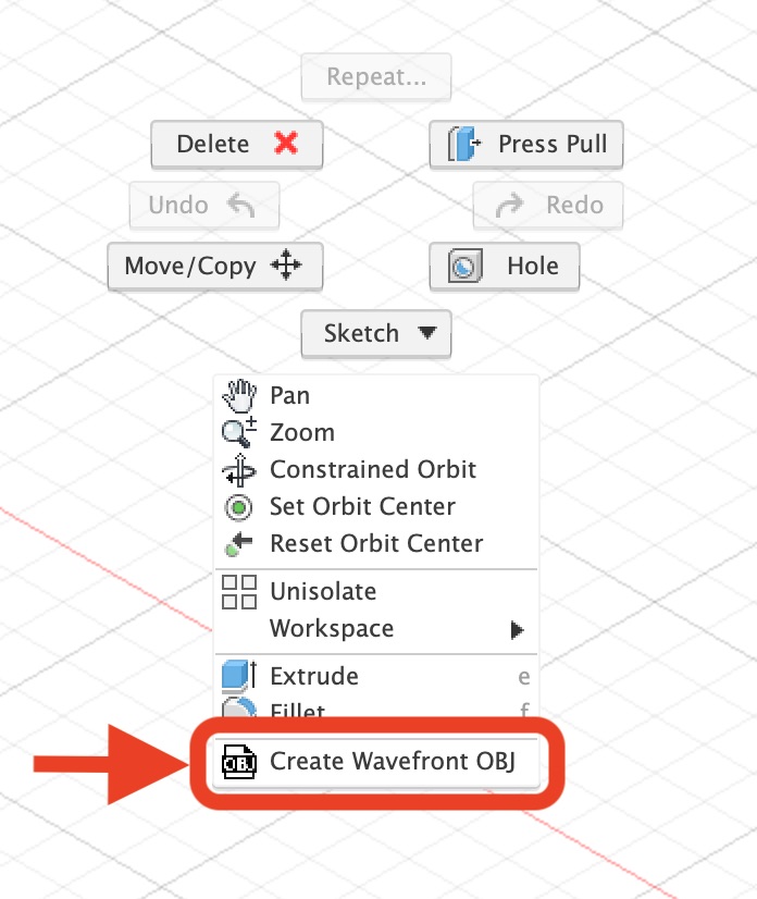 The OBJ file is generated from user-specified "bodies" of a 3D model. You have the option to export ALL "bodies", ALL "visible bodies" or just user-selected "bodies". There are quality options consisting of "Best", "Low", "Normal", "High" and "Very High". You also have the option to modify the output scale (default scale of 1.0), the option to include "normals" and the option to export the material template library (.mtl) file. You can quickly export using the right-click context menu that will export the model using the previously used settings.