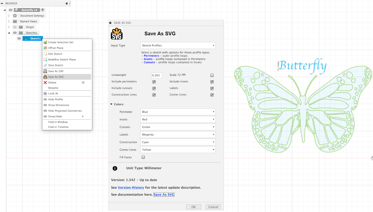 After creating and finishing a sketch, users simply right-click on the sketch in the browser tree and select the “Save to SVG” option.