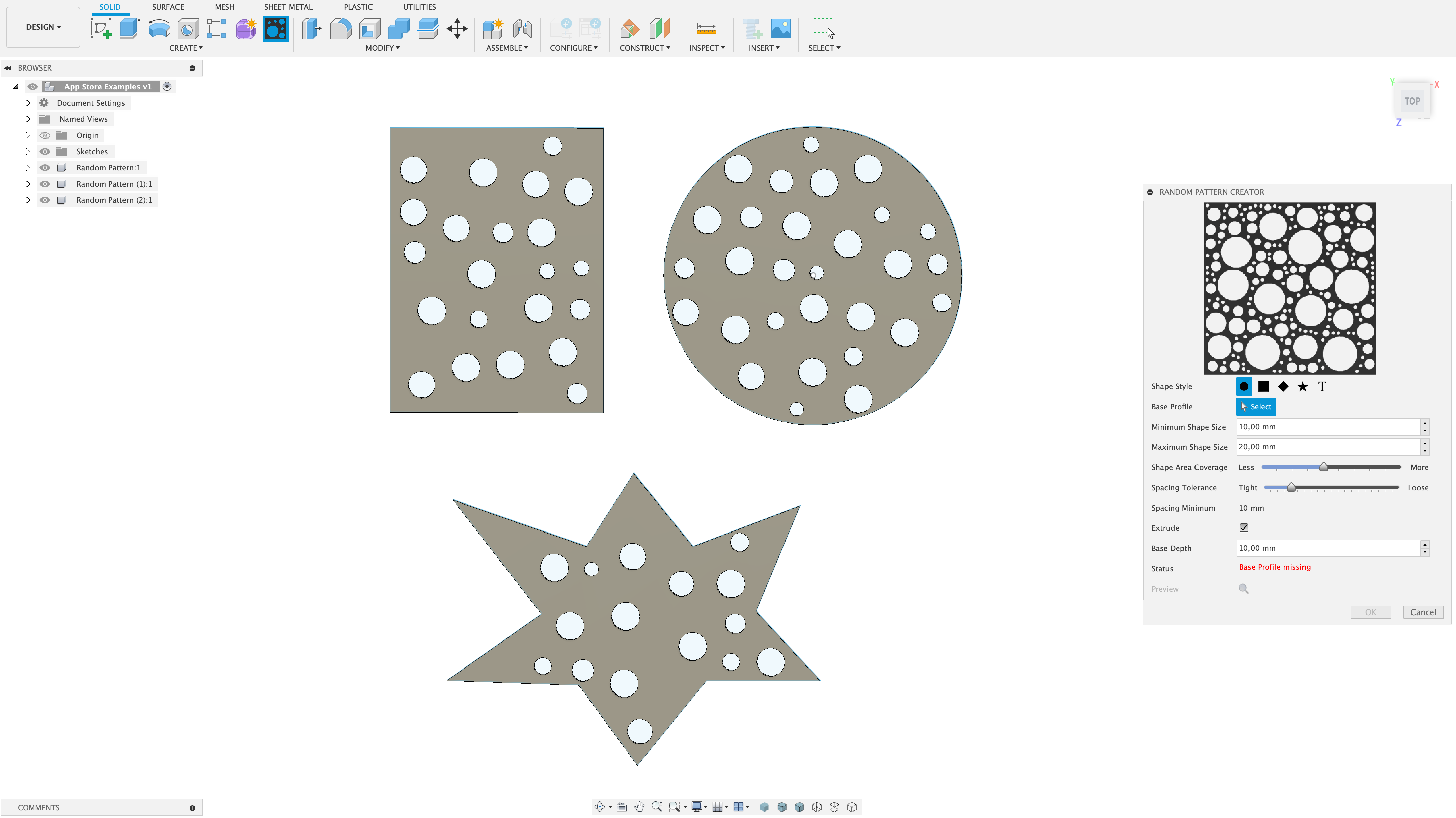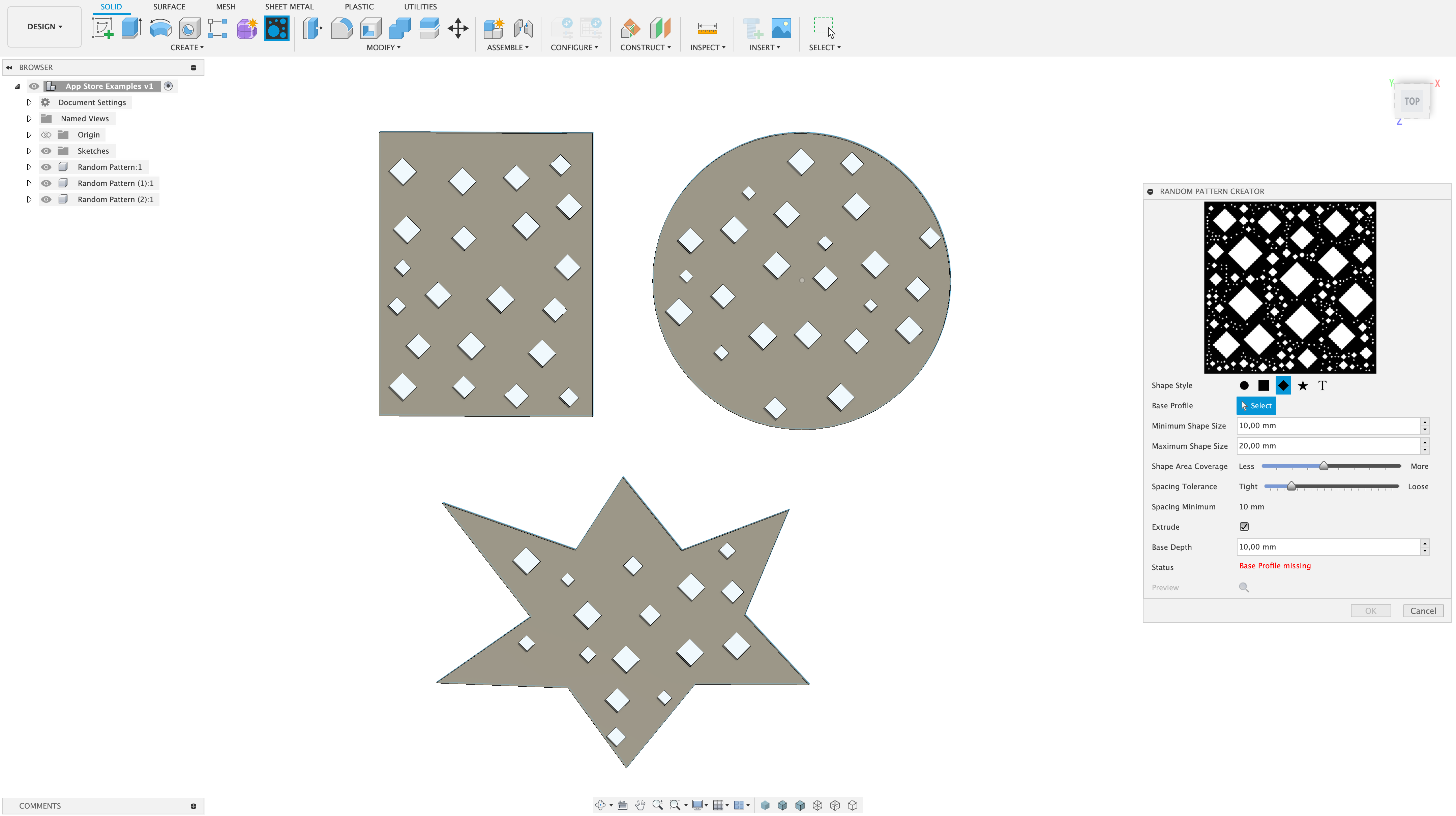 Due to popular demand, the app was updated to use a sketch profile as the base. To use the new version, you will need to draw a sketch of the base profile and then select the sketch profile when you create a new random pattern.