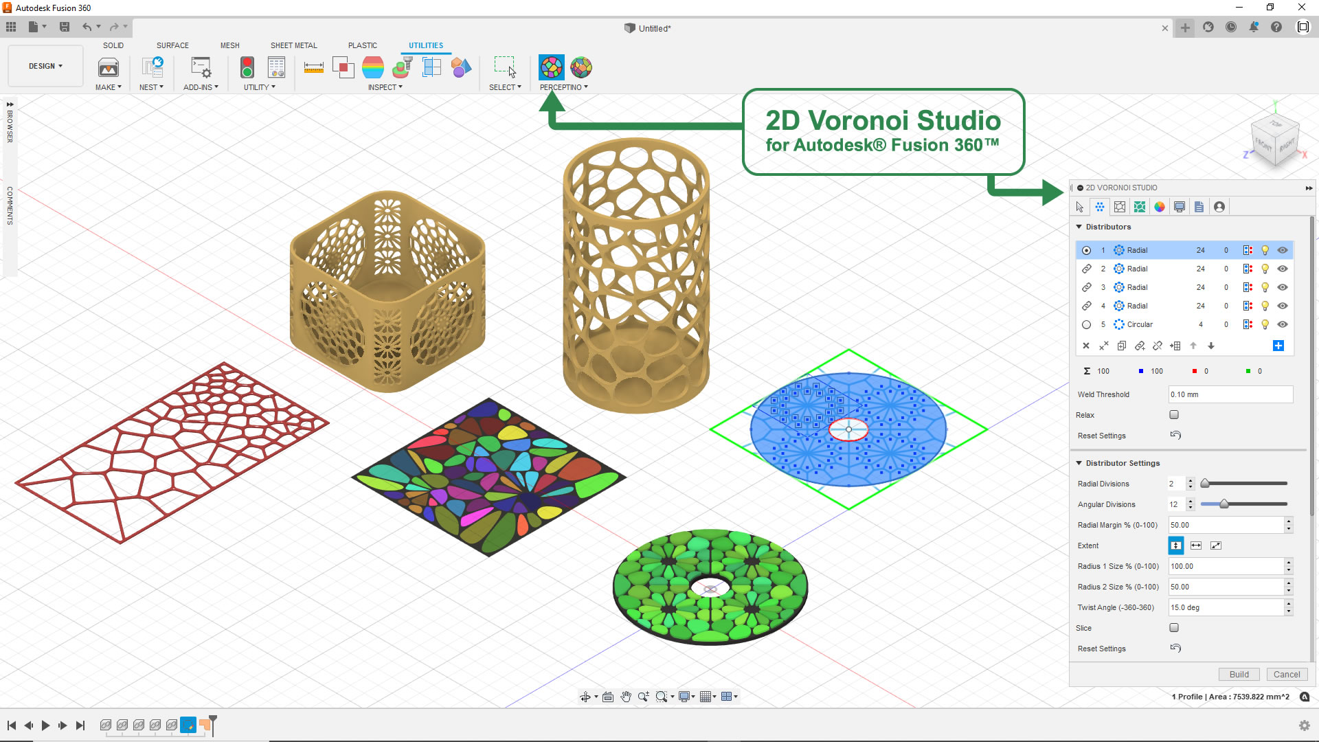 This product is a bundle of two add-ins: 3D Voronoi Studio and 2D Voronoi Studio. Using them you can quickly generate 3D and 2D Voronoi designs (Voronoi Solid Bodies and Sketches) in Autodesk® Fusio®