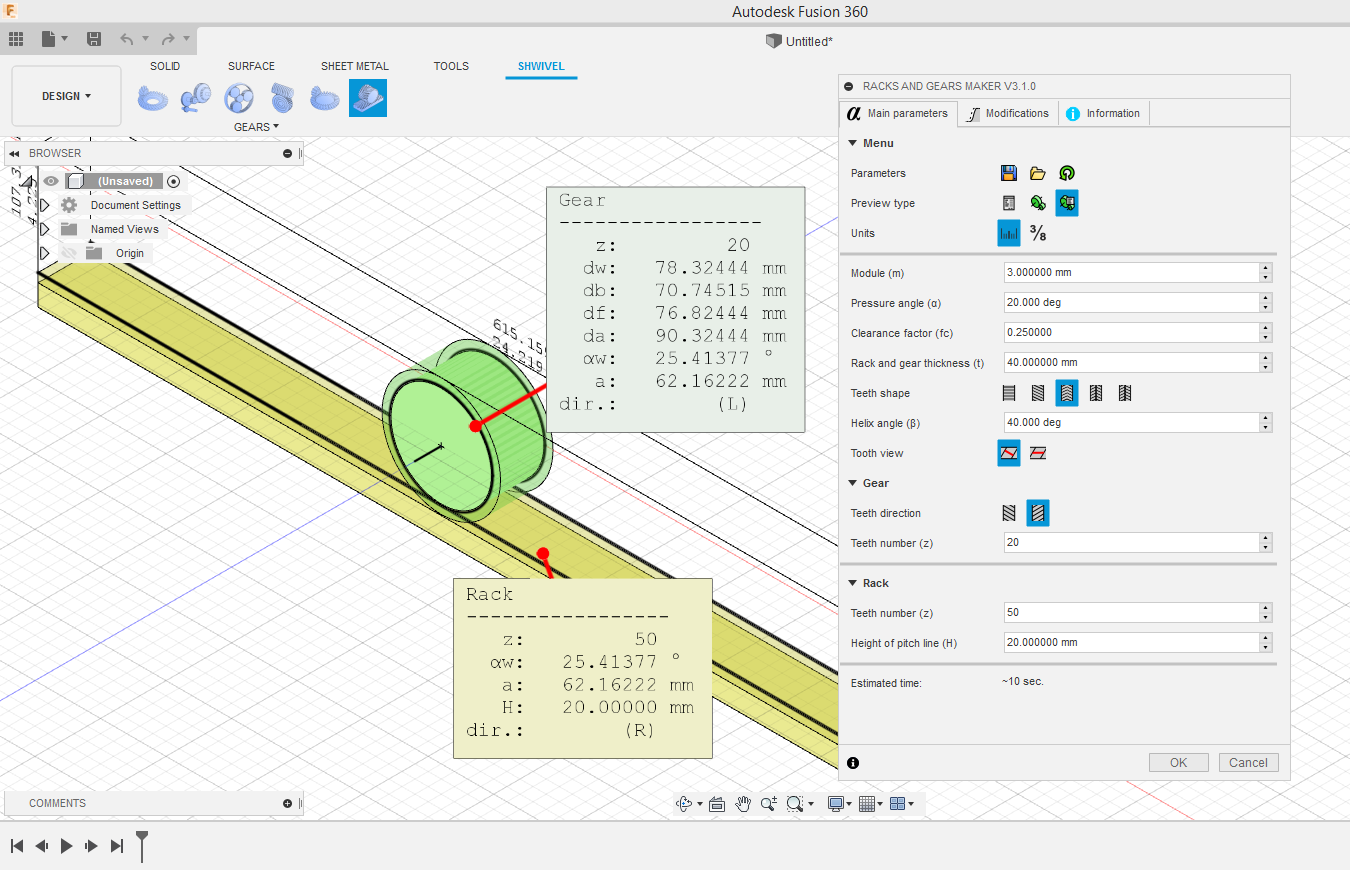 The plugin creates a rack with gear with straight, helical, double helical, herringbone and arc teeth for various set of parameters. The program lets to choose the system of modules, dimensioning of module, units and much more. Parameters and descriptions of functions are available in Guide.pdf. Information about invoices is available in Consulting Services section (please click More to expand the section).