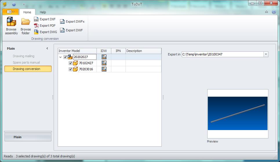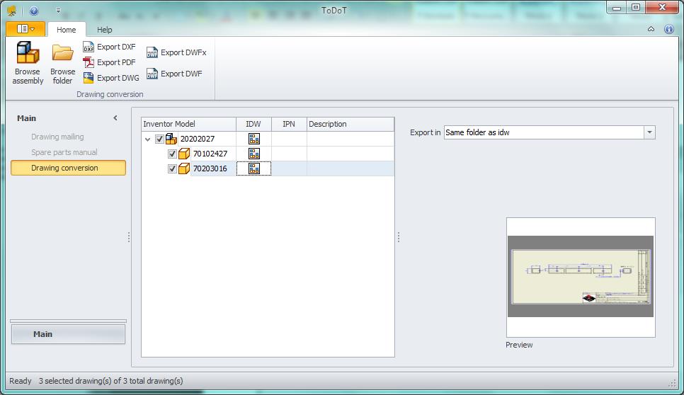 ToDoT CA, created by Singeca sas (https://www.singeca.it/en) is an application designed to facilitate the work of converting and printing inventor projects. Here you can find the quick guide and the videos to see immediately how it works: https://www.singeca.it/en/todot-ca-help/inventor-user-guide/ . The main features include: