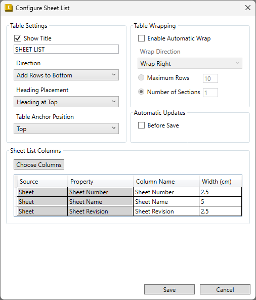 I suggest that the sheet list should be an individual list for each drawing package, allowing different titles and column configurations per package.