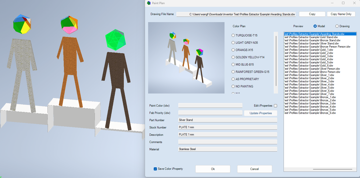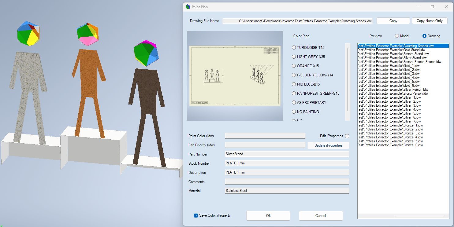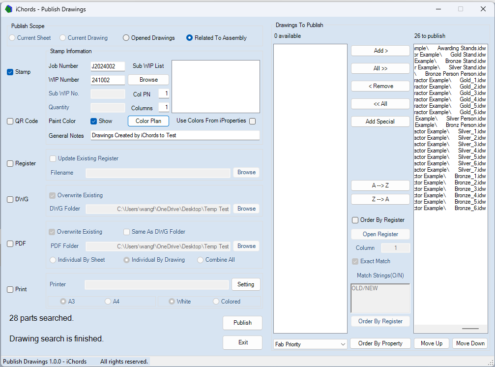 1. For the first time to use iChords - Publish Drawings, a configuration file (.INI) needs to be created in Inventor to convert IDW to DWG/DXF. Start the command "Publish Drawings" from the ribbon tab "iChords". Click the button "Setting" and select the configuration file INI in the field "AutoCAD Converting Config File", set the values for thumbnail size, QR code location, size, and content, and select the printer and paper feed tray.