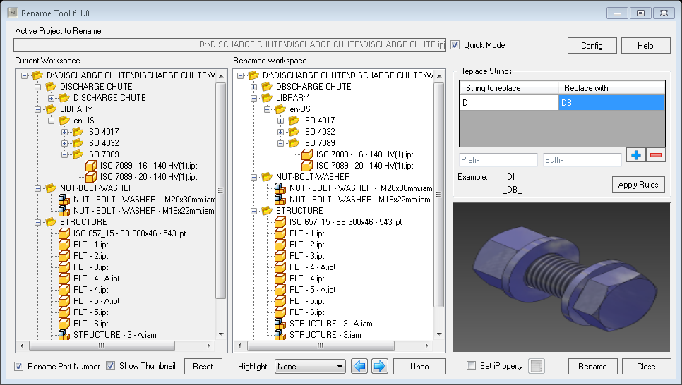 Rename tool does not work with Vault. Also, you need WorkSpace being defined in the project to run this tool.