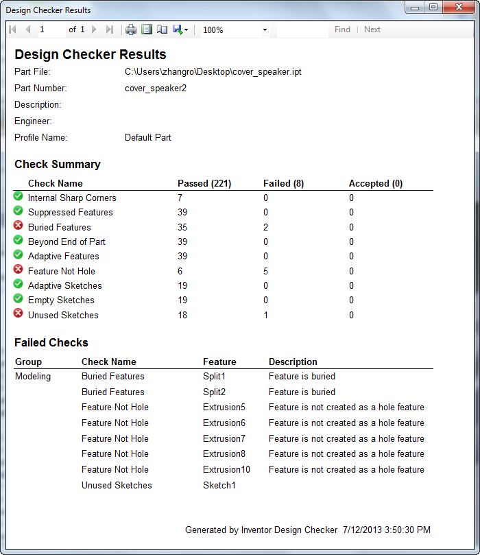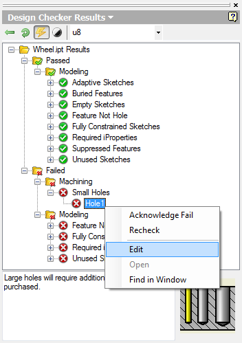 1.0.12 Support Inventor 2022. 1.0.11 Support Inventor 2021. 1.0.10 Support Inventor 2020. 1.0.9 Enable the Design Checker Results browser even the Enable LiveCheck is unchecked. 1.0.8 Enable the addin for Inventor 2019. 1.0.7 Fix a bug when double click gauge may raise error. 1.0.6 Enable the addin for Inventor 2018. 1.0.5 Enable the addin for Inventor 2017. Fix a bug that when do shrinkwrap it raise error. Fix a bug so that when Live Check is checked it will re-check a document when it is just opened.. 1.0.4 Enable the addin for Inventor 2016. Fix a bug that live check indicators are not hidden when their related documents are deactivated. Fix a bug so that the Overlay View would not be regarded as the Overlapping Views failure. 1.0.3 Enable the addin for Inventor 2015. Fix a bug that when new an assembly profile there is an unassigned check (Assembly Constraints). 1.0.2 Fix a bug that Hole Size Increments numbers causes exception in French OS. Fix a bug that returns unnecessary failure for weldment component. 1.0.1 Fix a bug which returns wrong hole accessibility result. 1.0.0 Initial release. |