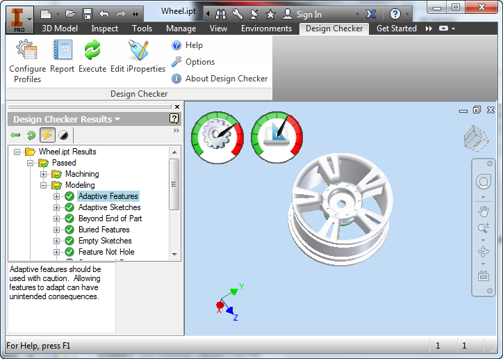 1.0.11 Support Inventor 2021. 1.0.10 Support Inventor 2020. 1.0.9 Enable the Design Checker Results browser even the Enable LiveCheck is unchecked. 1.0.8 Enable the addin for Inventor 2019. 1.0.7 Fix a bug when double click gauge may raise error. 1.0.6 Enable the addin for Inventor 2018. 1.0.5 Enable the addin for Inventor 2017. Fix a bug that when do shrinkwrap it raise error. Fix a bug so that when Live Check is checked it will re-check a document when it is just opened.. 1.0.4 Enable the addin for Inventor 2016. Fix a bug that live check indicators are not hidden when their related documents are deactivated. Fix a bug so that the Overlay View would not be regarded as the Overlapping Views failure. 1.0.3 Enable the addin for Inventor 2015. Fix a bug that when new an assembly profile there is an unassigned check (Assembly Constraints). 1.0.2 Fix a bug that Hole Size Increments numbers causes exception in French OS. Fix a bug that returns unnecessary failure for weldment component. 1.0.1 Fix a bug which returns wrong hole accessibility result. 1.0.0 Initial release. |