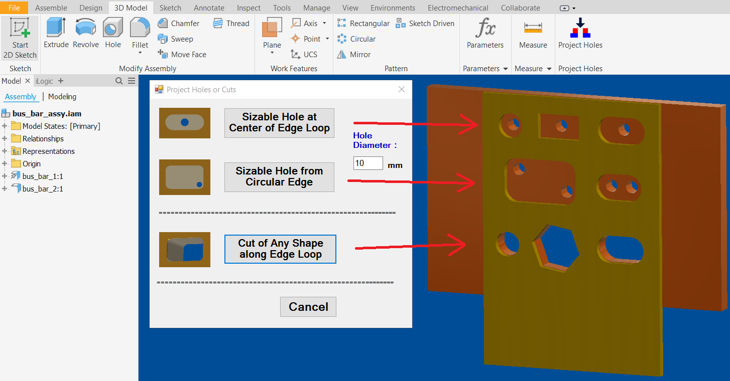 As shown in the App icon and pictures and videos below, in an assembly, this App is used to pick edge(s) of various holes or cuts with closed-loop edges from the front part (part A, in yellow color), then project (create) sizable holes or exact profile cuts into the back part (part B, in copper color). The resulting holes or cuts are through-all features residing in the back part (part B).