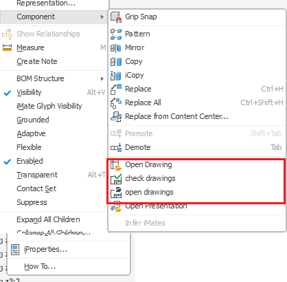 Open drawings –Open all reference component drawings from the assembly document with an option for processing levels – First level components, all level components, It can be set up to ask about processing levels when executed. It can be run for selected components or for active documents, for selected component subcomponents.