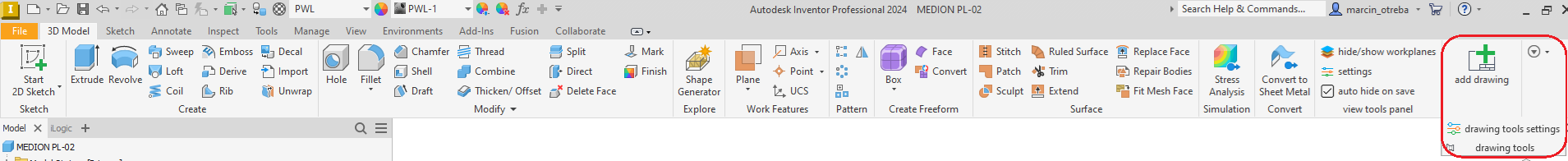 Add drawing -The user can add a drawing for the model using this functionality by simply choosing the existing drawing as a source. It will save it regarding settings and replace the reference to the model.