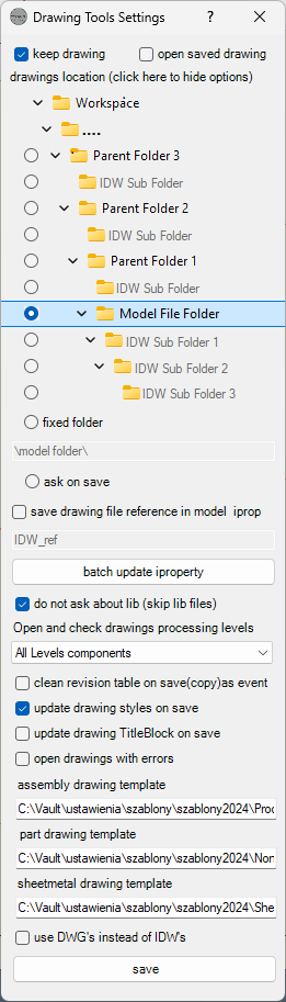 Save drawing – after setting up options according to user saving rules and workflows IDW (if it exists for saved as a model file) will be saved together with the model on: