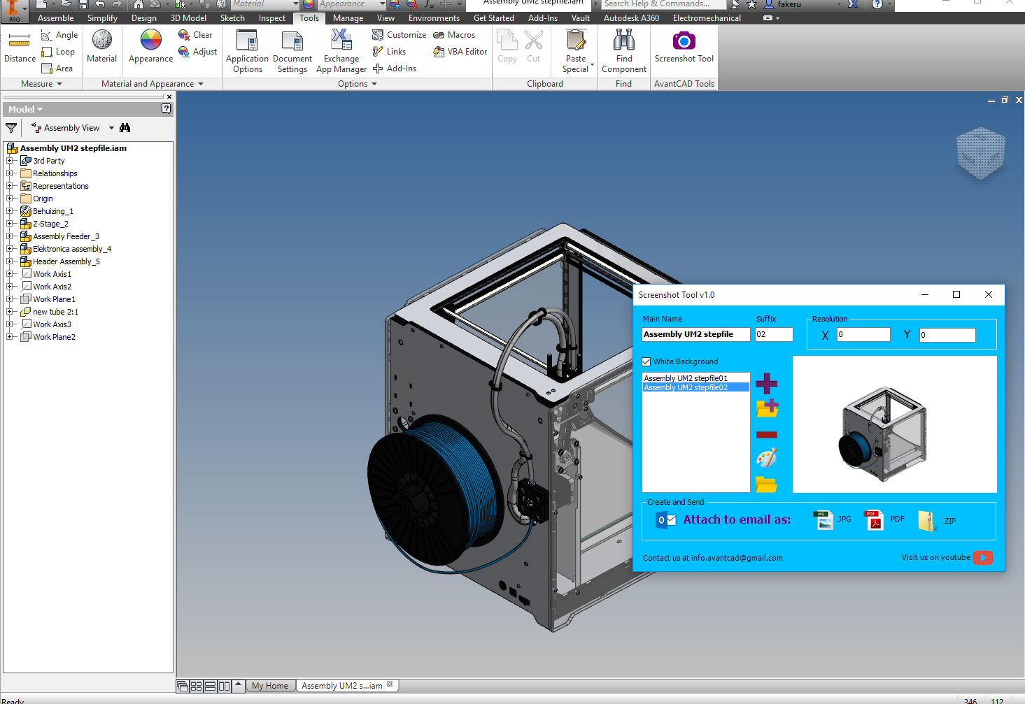 - Screenshots creation of the Inventor active window as .JPG files. The screenshots are saved in a folder named “Screenshots” which is under the project’s workspace folder.