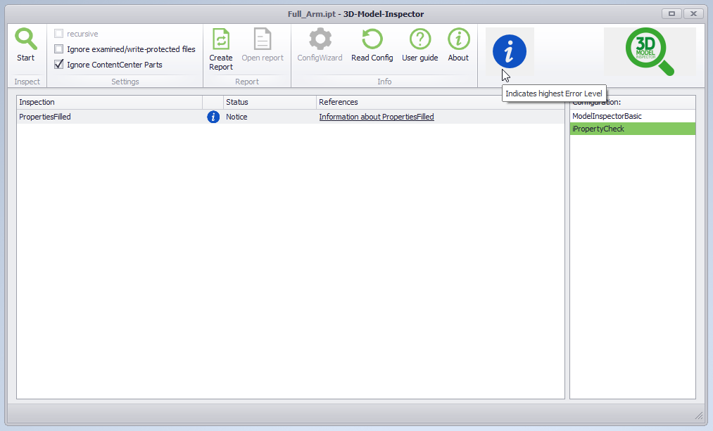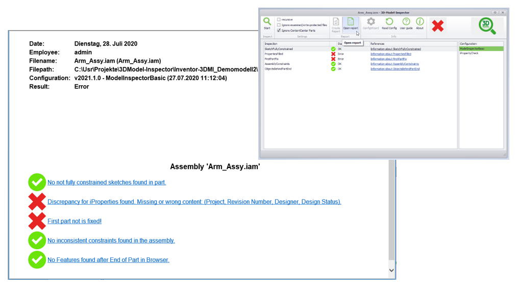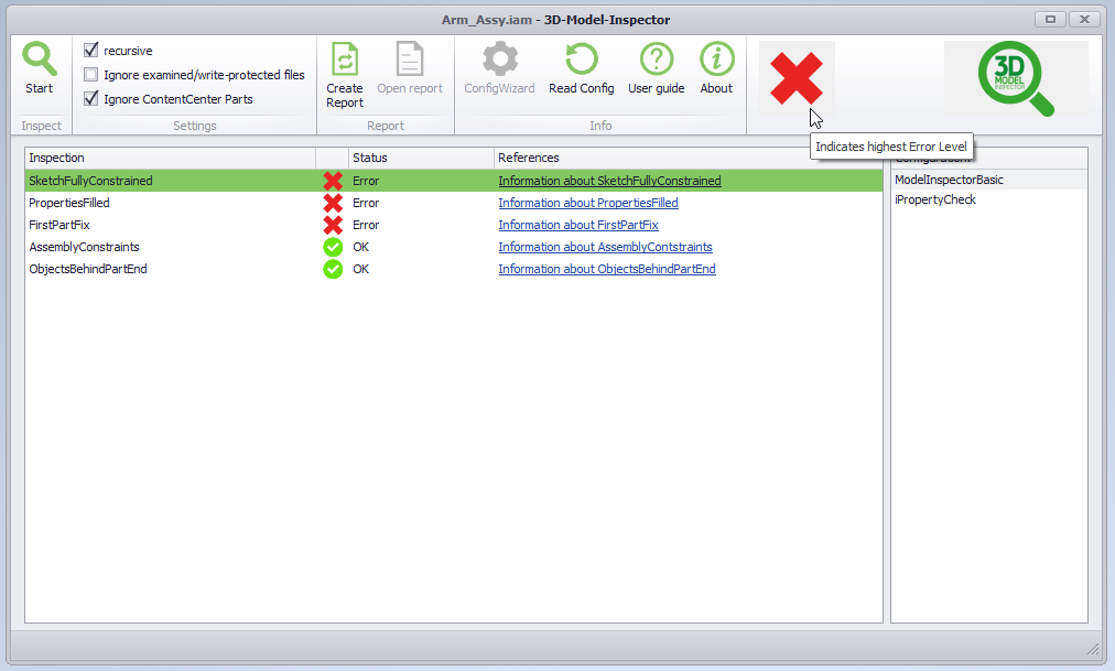 3D Model-Inspector Basic is designed as a free trial to get an idea of working with 3D Model-Inspector AddIn and to demonstrate Inventor users how easy a "One-Click" Model-check could be. - A scalable Addin (integrated Inventor Addin with extended functionality), designed for quick and comprehensive check of the current Inventor model, with an optional check of all associated substructures.