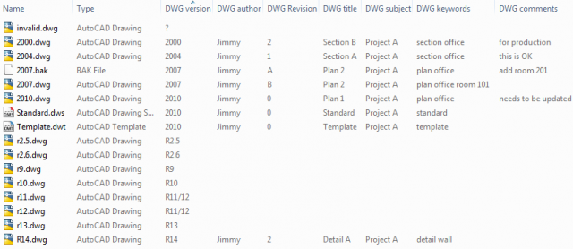 The columns can show the version of the DWG file, up to 30 custom properties, title, subject, author, comments, created, hyperlink base, keywords, last saved by, last updated, revision number, DWG Editing Time, DWG Created By (can for example show AutoCAD 2017 or Inventor 2017), DWG ID (for example ACAD0001409 making it possible to see the difference between a drawing created in AutoCAD or AutoCAD Architecture. ODA can show for a DWG created with the Open Design Alliance API), DWG Reg (Version in the registry, for example, 210 that stands for R21.0) and DWG Build (AutoCAD build number, for example, N5200x64).