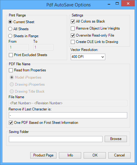 PDF AutoSave saves the copy of the Autodesk® Inventor® drawing automatically to PDF during Save command. There are multiple options for file naming and save location.