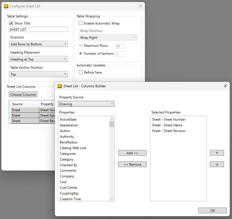 I suggest that the sheet list should be an individual list for each drawing package, allowing different titles and column configurations per package.