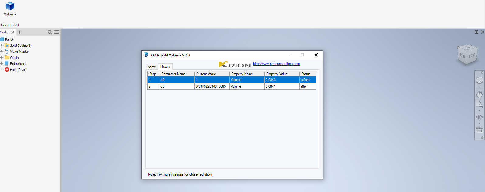iGold Volume is a handy tool for Product design engineers who make multiple trials to find a target value of one or more parameters that will result in achieving a matching property of the product Volume.