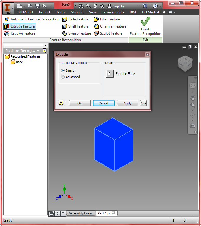 The Feature Recognition application converts neutral 3D CAD models, such as STEP, SAT, or IGES solids, into full-featured Autodesk® Inventor® models.