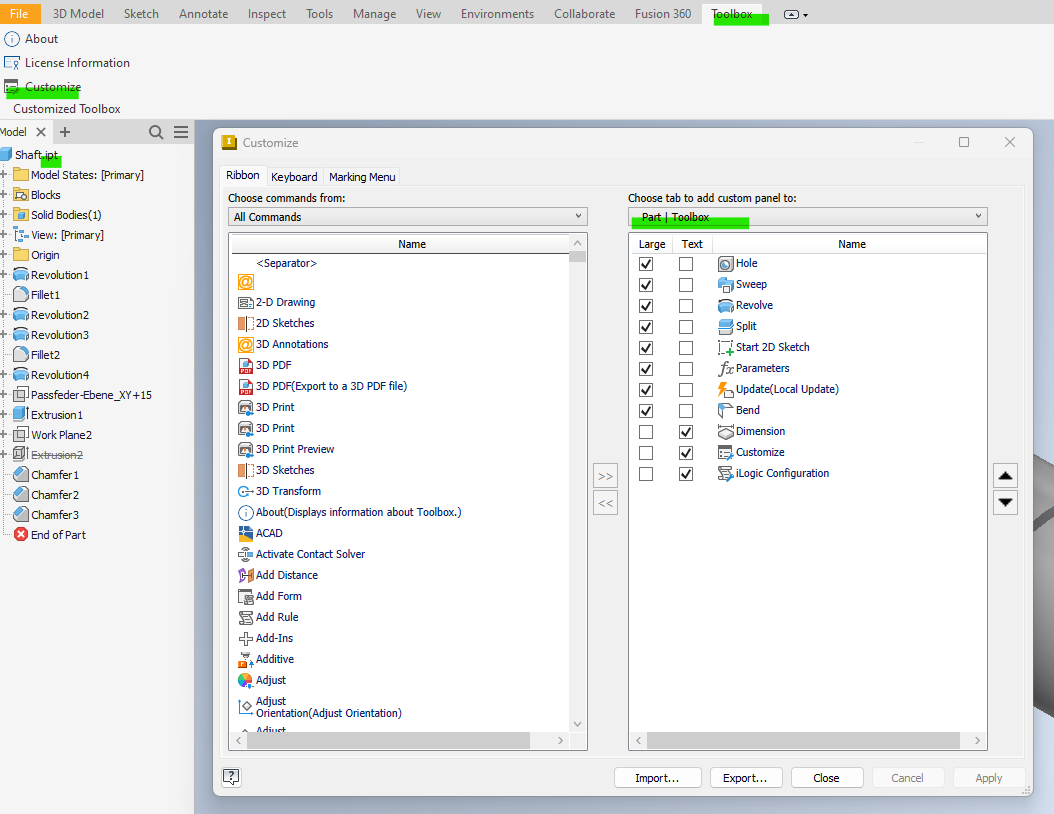 This gives you the fastest access to all command icons you use. The search for commands in the tabs of Inventor ribbon is omitted. You make the assignments once using the Inventor command "Customize". From now on, your customized toolbox will be at your disposal for efficient work in any new Inventor session. To transfer the toolboxes from one version to another just use the export-and import functionality customizes menu. For 30 days after installation, the app is available in trial mode.