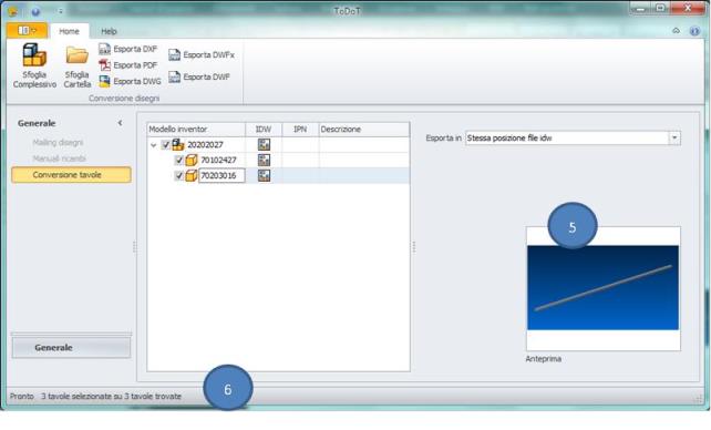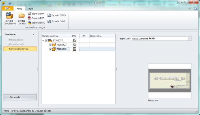 Nota: la tavola deve essere salvata nella stessa directory del 3D corrispondente. Infine coi pulsanti di comando Esporta DXF, Esporta PDF, Esporta DWG, Esporta DWF si lancia la conversione dei file selezionati. Nella parte destra della schermata, sopra alla immagine di anteprima, un selettore permette di scegliere il percorso dove salvare i file convertiti, oppure decidere di lasciarli nella medesima cartella della tavola .IDW da cui originano.