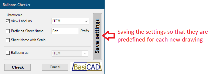Thanks to the Save Settings button, it is possible to save the standard settings for all future drawings. For drawings where the tool has already been used, the settings are stored in the drawing.